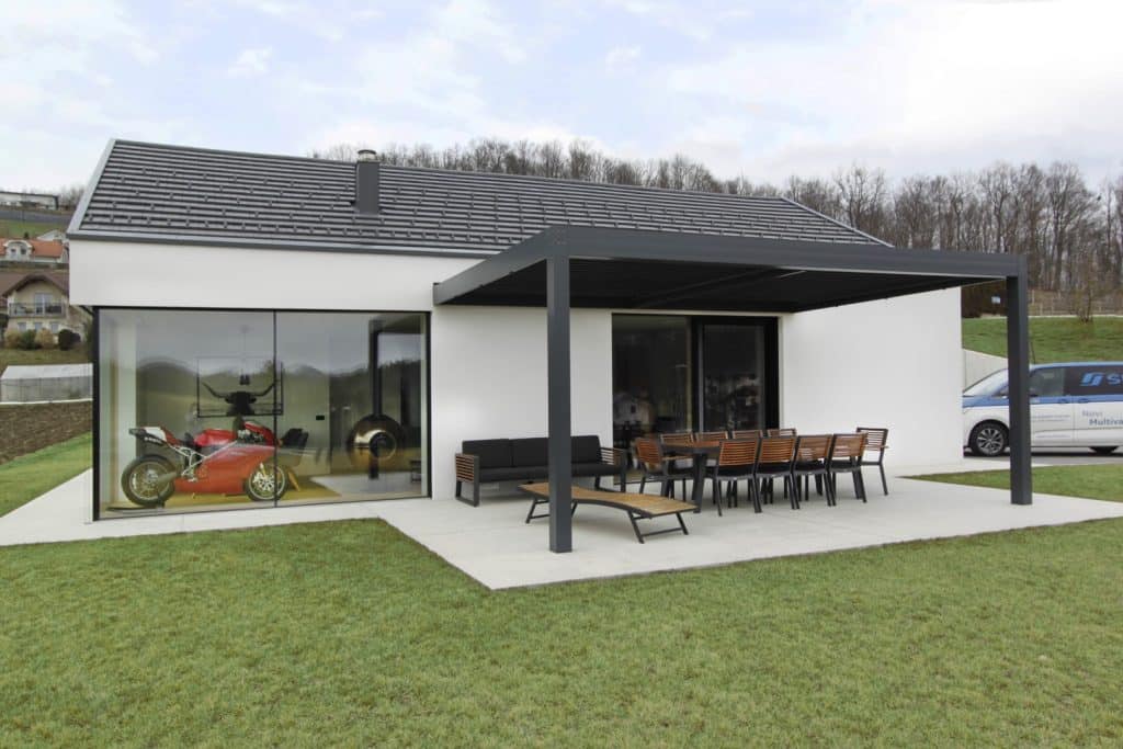 Parcela je sicer omogočala izgradnjo večjega doma, a je lastnik vseskozi vedel, da potrebuje tudi uporabno, sodobno in prostorno garažo, ki se sklada z arhitekturo hiše. »Garaža je moj prostor za meditacijo,« pripoveduje lastnik. »V notranjosti sva s prijateljem izdelala delovni pult in opremila prostor tako, da imaš občutek, kot da si v dirkaškem boksu. Igrače v njej pa naredijo moj najljubši prostor.«