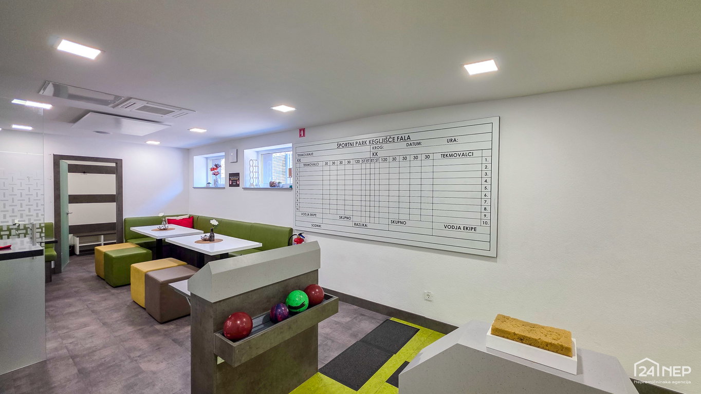 Zemljišče: 1.182 m², Gostinski del – pritličje: Lokal, sanitarije, kuhinja: 240 m² • Kegljišče, strojnica, kopalnica/garderoba: 130 m²