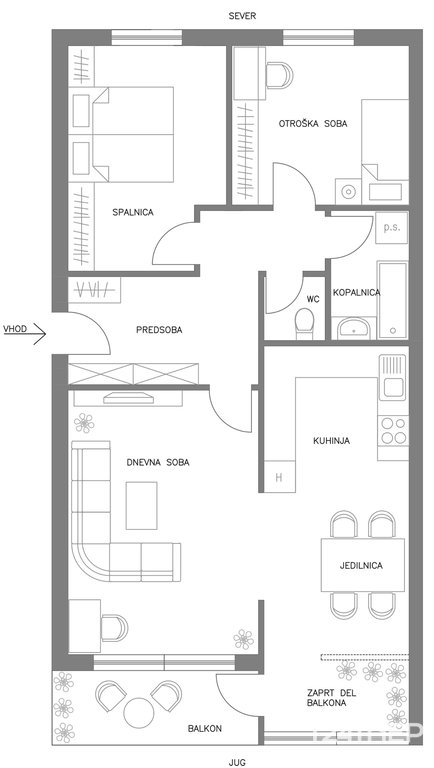 Iz predsobe levo pa se dostopa do spalnice, otroške sobe, kopalnice in ločenega wc-ja.