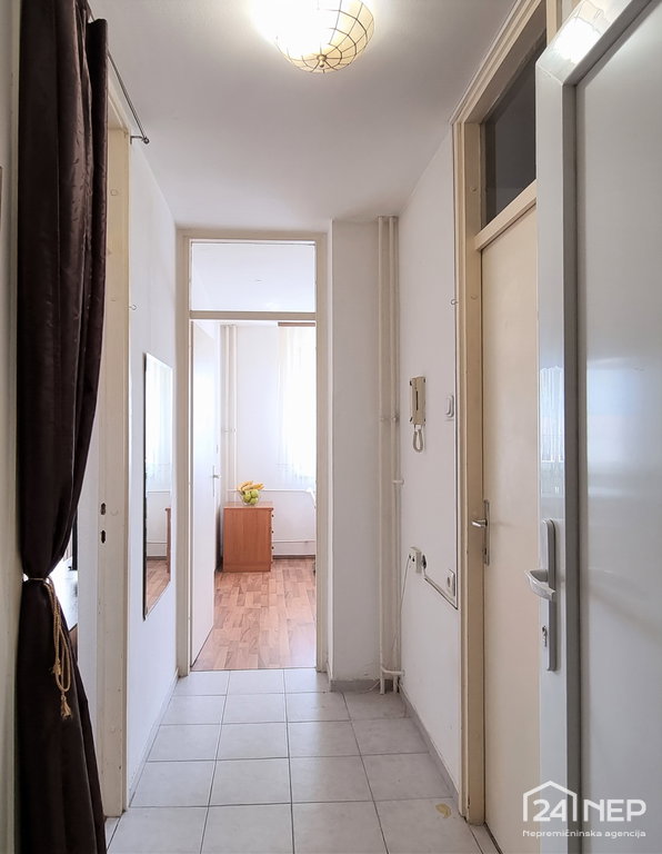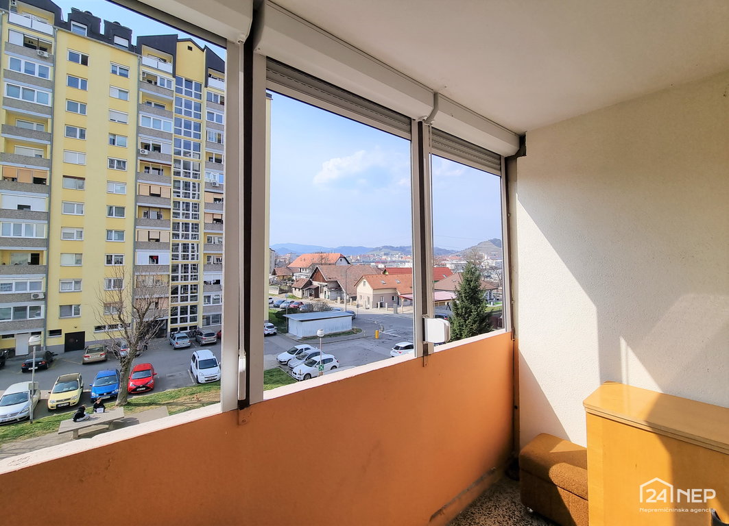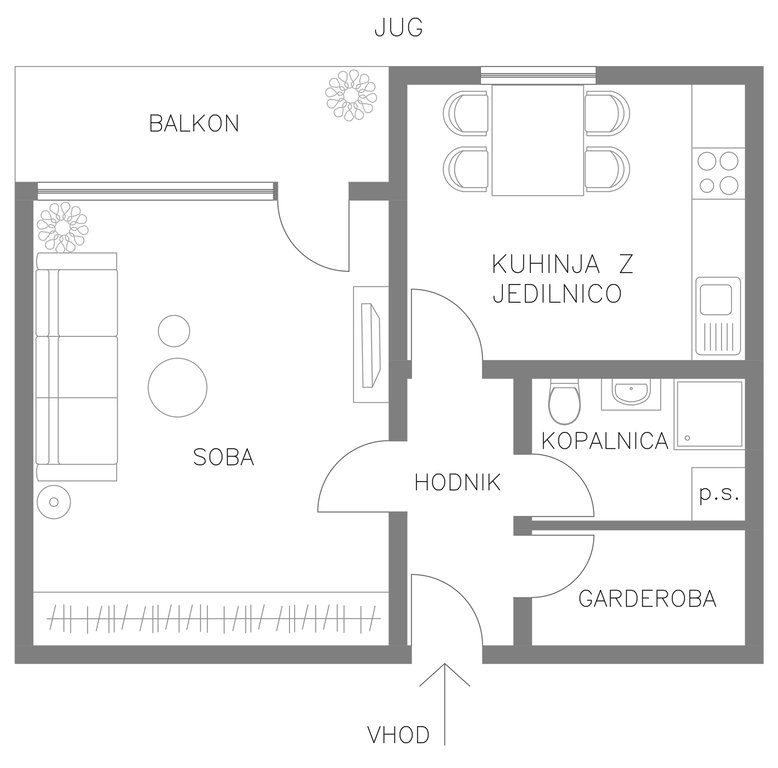 Razporeditev: predsoba, dnevno bivalna soba iz katere je izhod na balkon, kuhinja z jedilnico, kopalnica, dodatna garderoba/shramba.