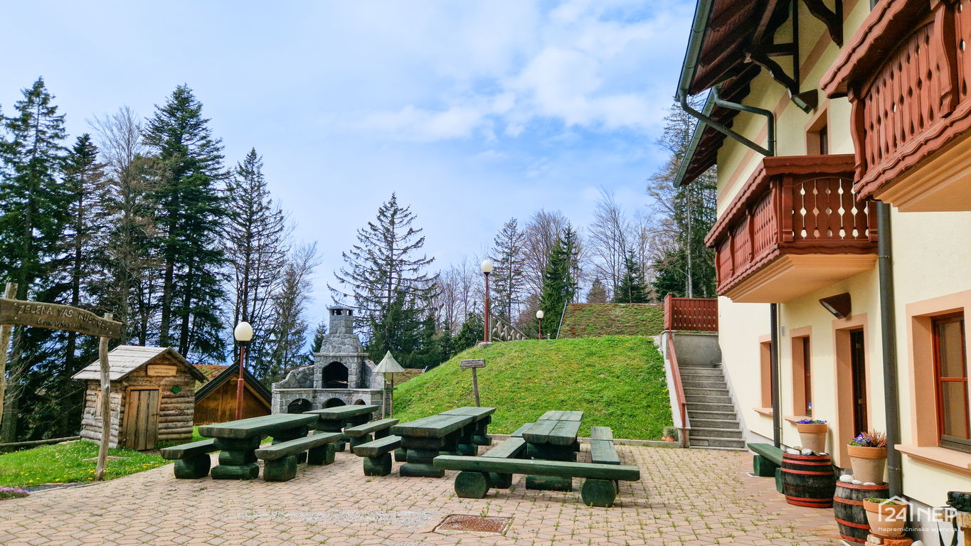 Na terasi je 6 lesenih masivnih miz s klopmi, ročno izdelan kamniti kamin ter odlagalni pult z vodo in pomivalnim koritom, otroška igrala ter drvarnica (prostor za drva in orodje). Vsakemu apartmaju pripada določena miza s klopjo.