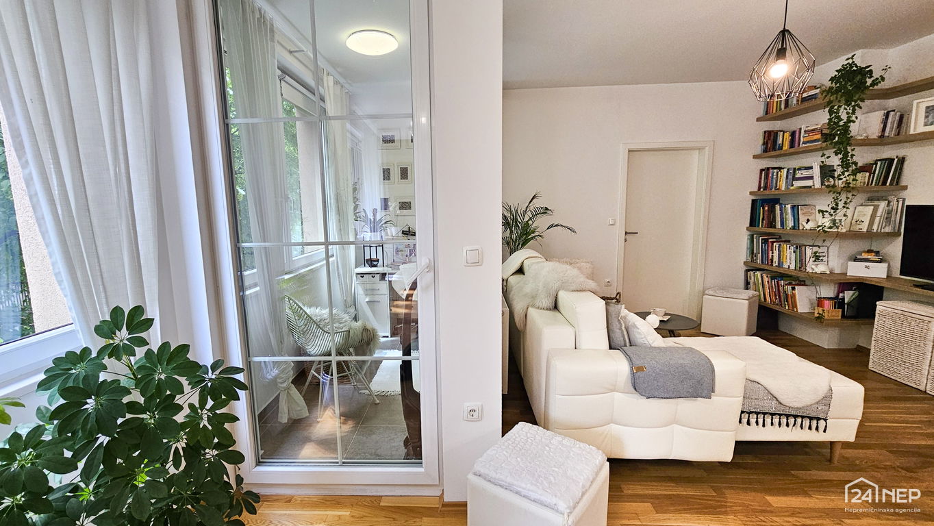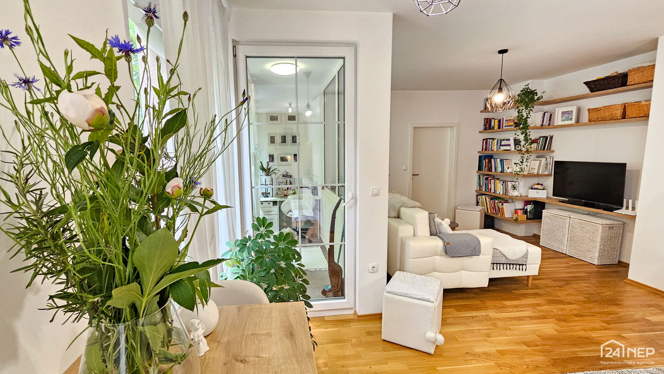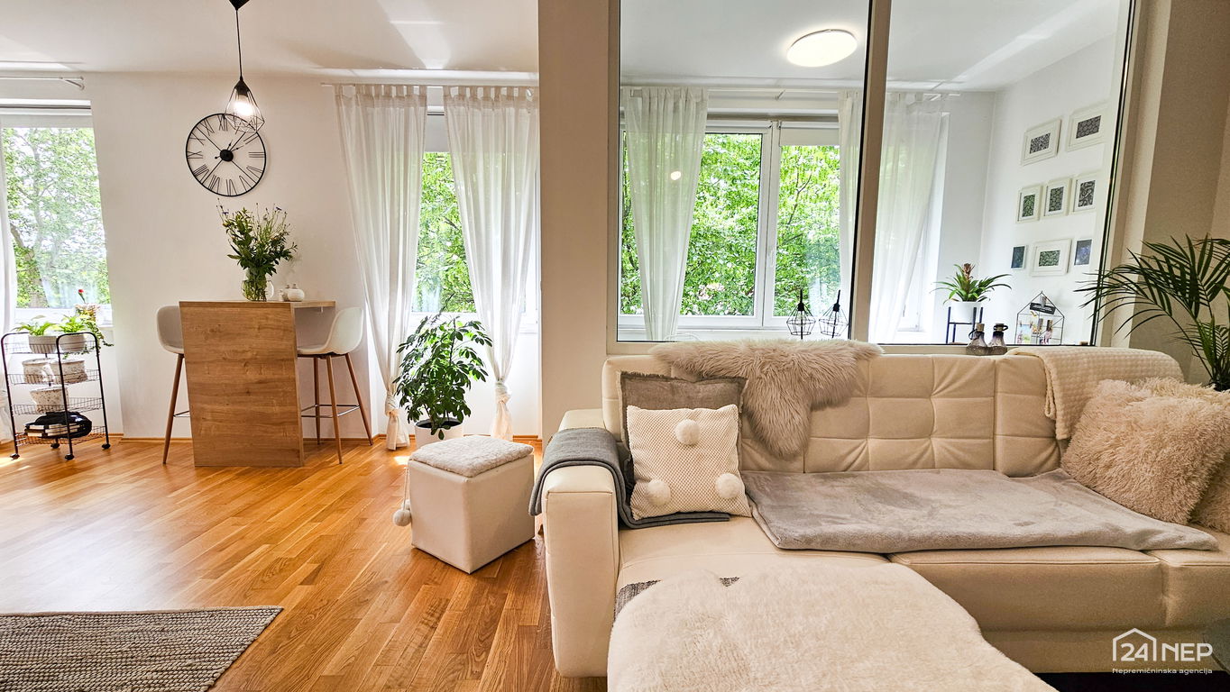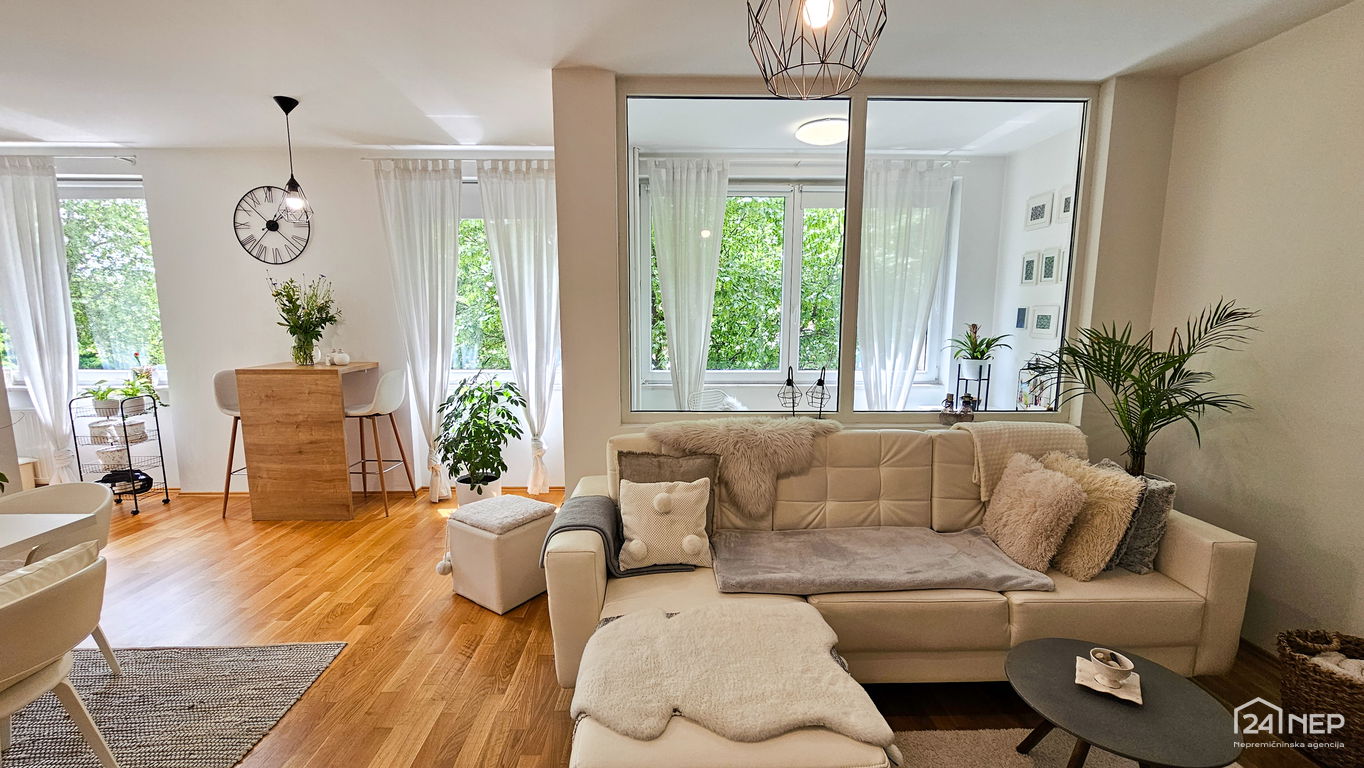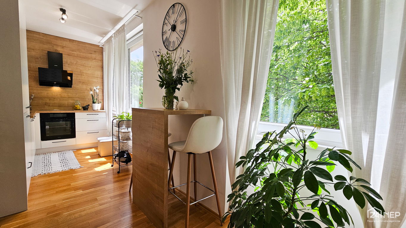 Čudovito 2-sobno stanovanje odlikuje svetla južna lega in veliko steklenih površin, ki jih krasijo zunanje krošnje dreves. Popolnoma obnovljeno in po meri izdelano pohištvo ter naravni materiali dajejo občutek uglašenosti in mirnosti.