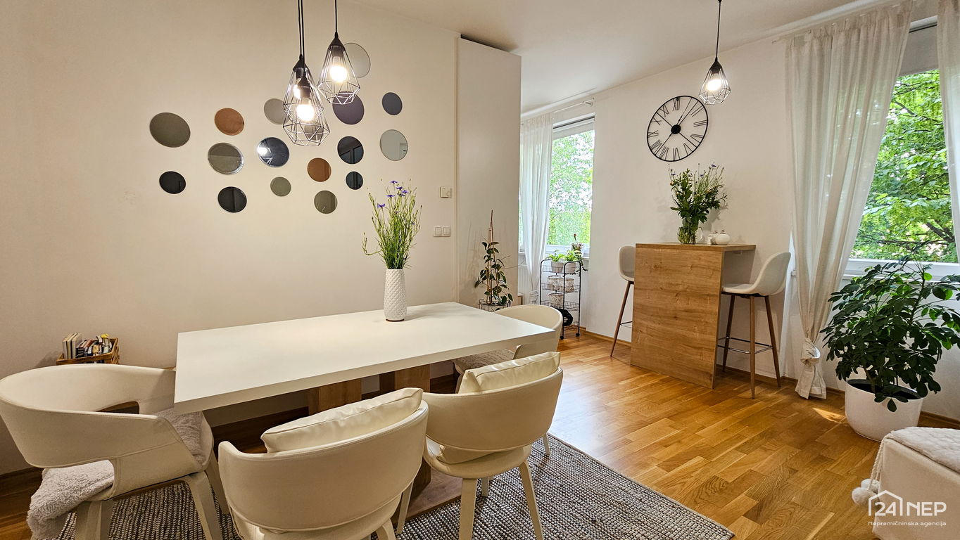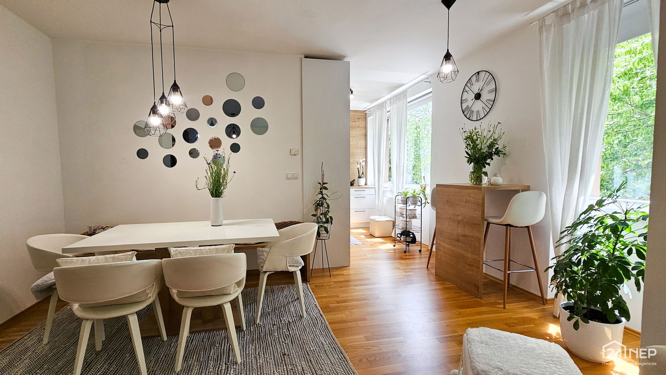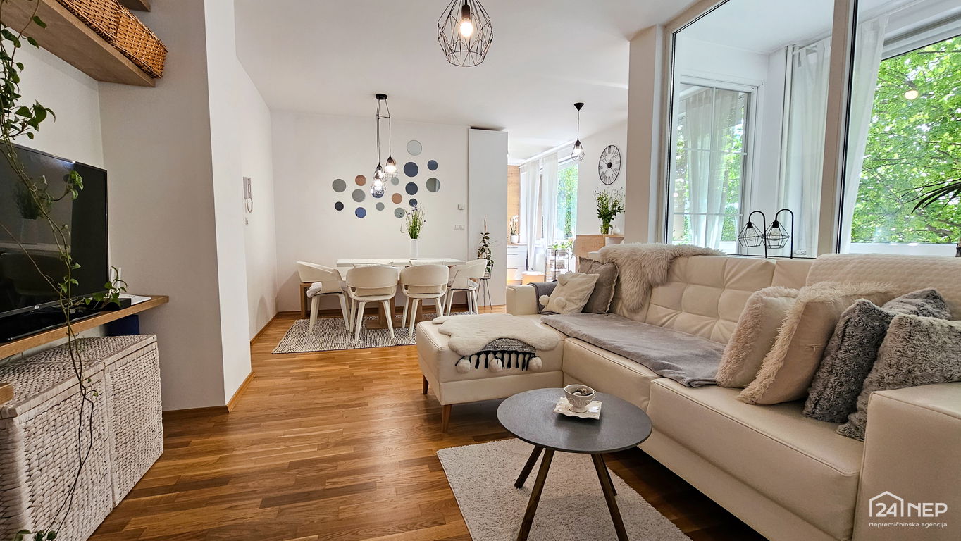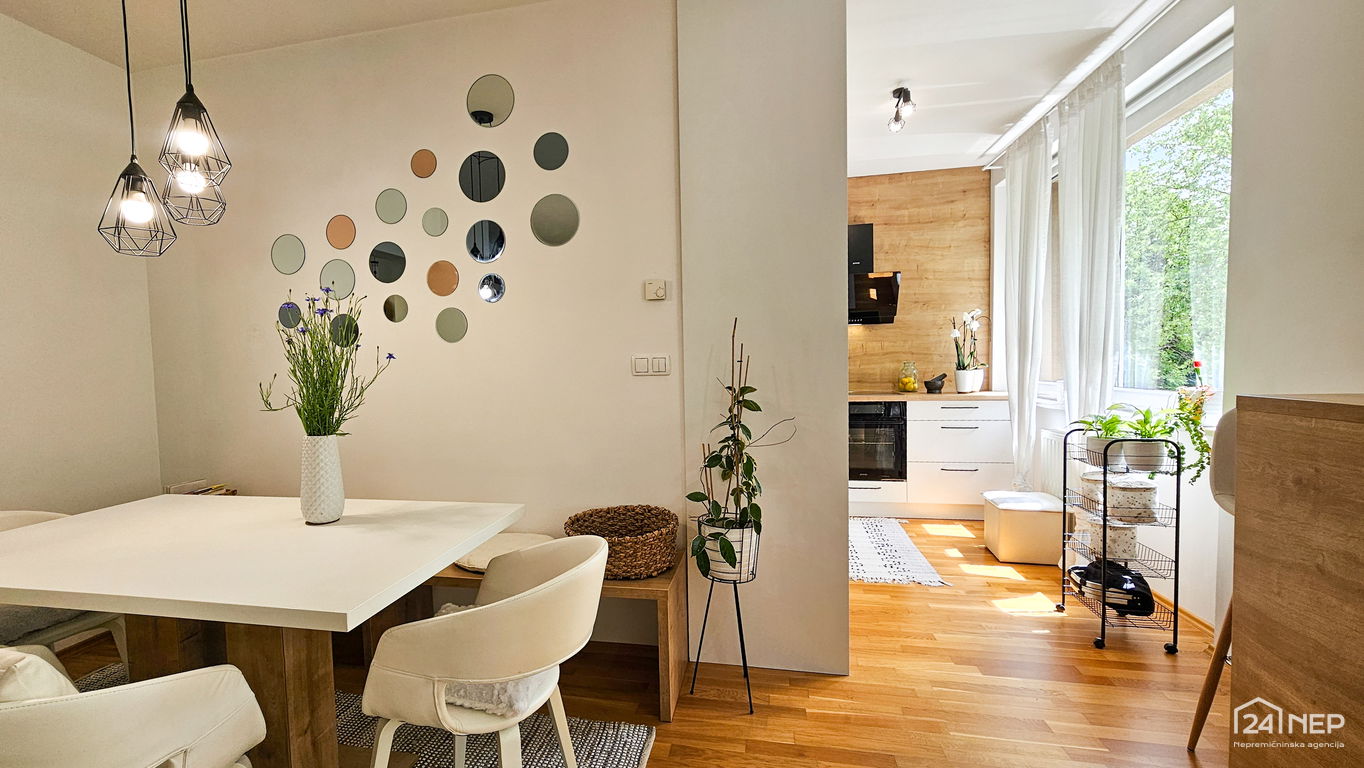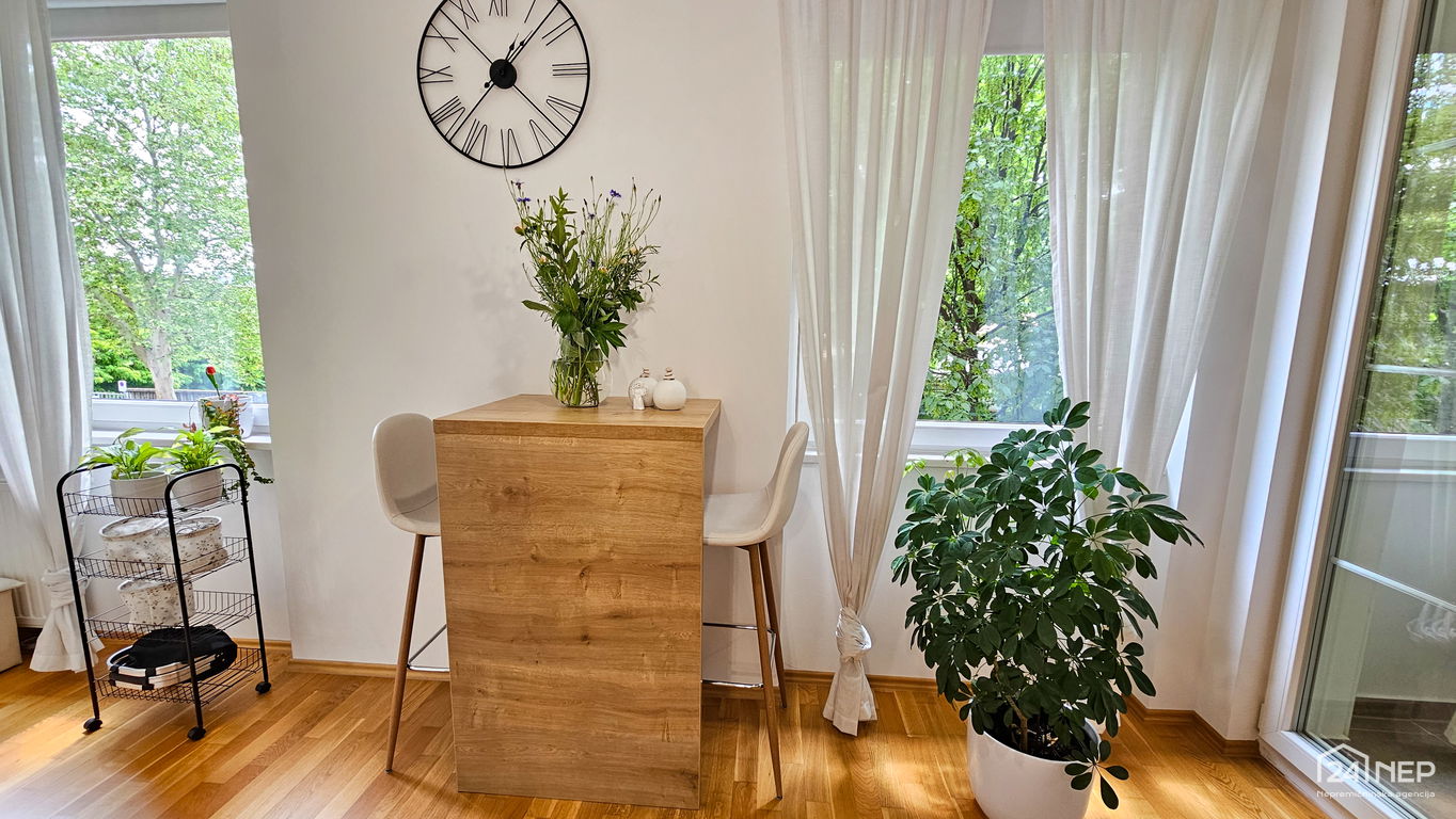 Čudovito 2-sobno stanovanje odlikuje svetla južna lega in veliko steklenih površin, ki jih krasijo zunanje krošnje dreves. Popolnoma obnovljeno in po meri izdelano pohištvo ter naravni materiali dajejo občutek uglašenosti in mirnosti.