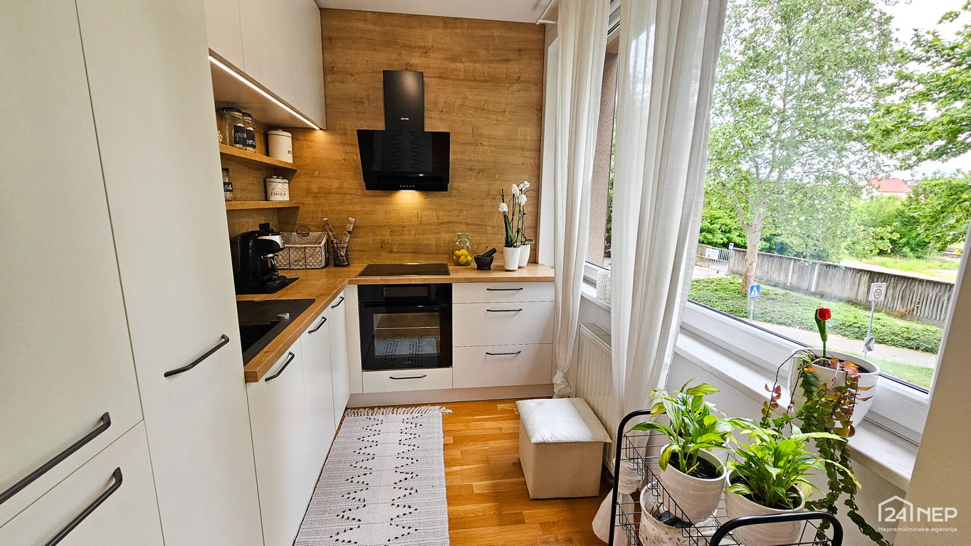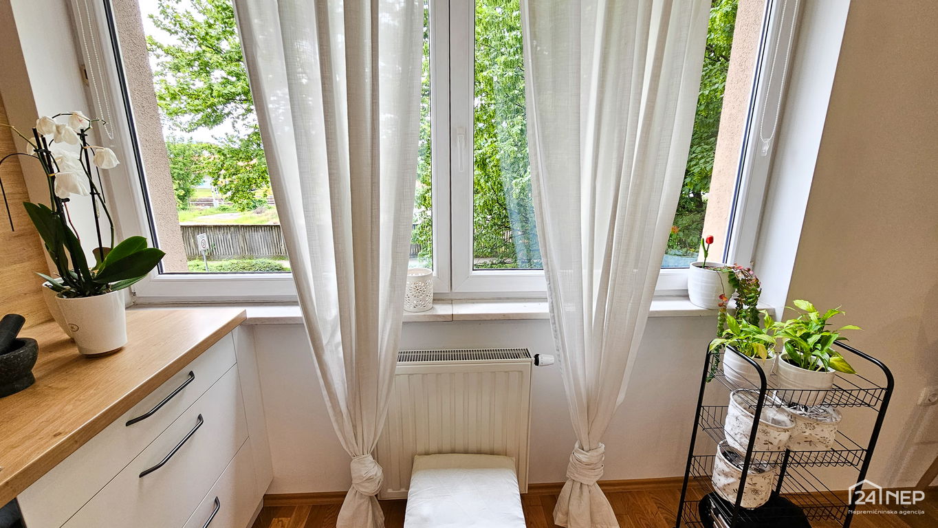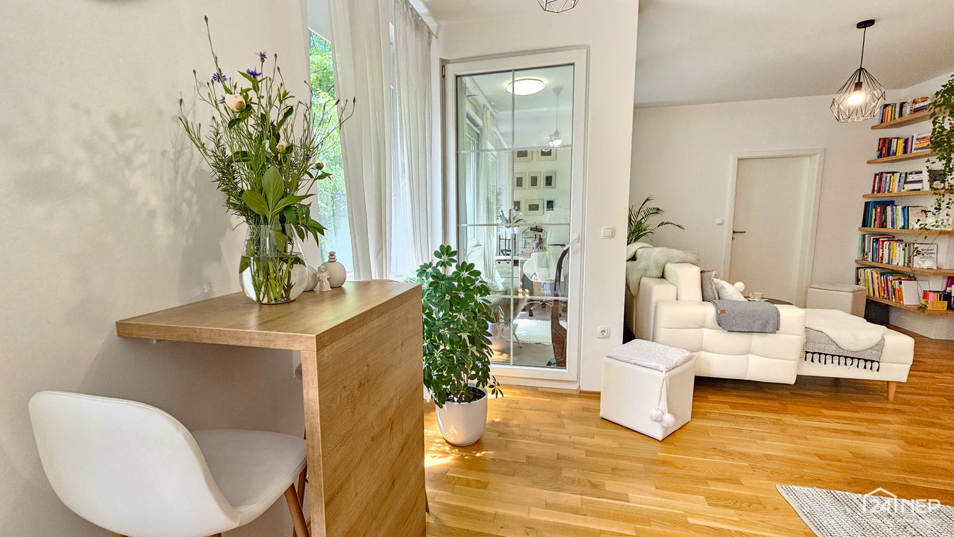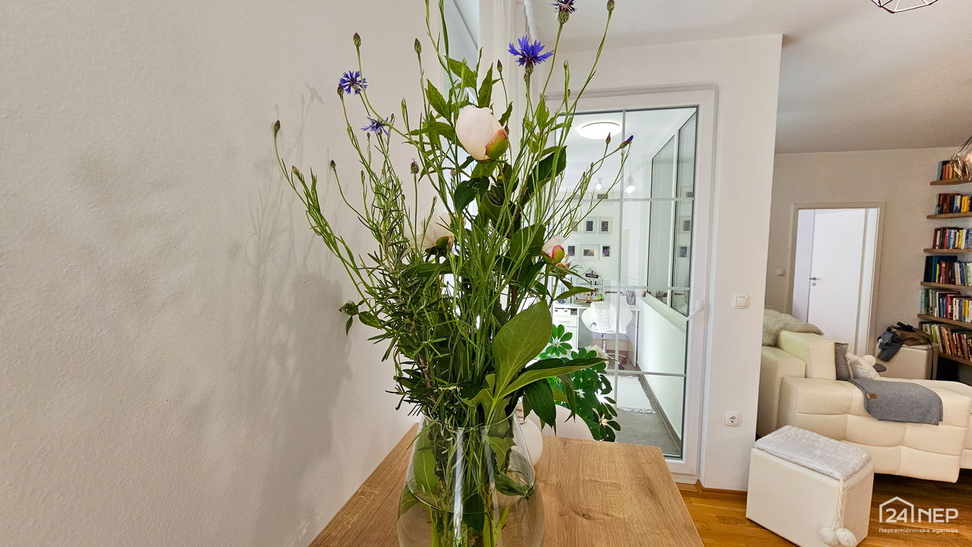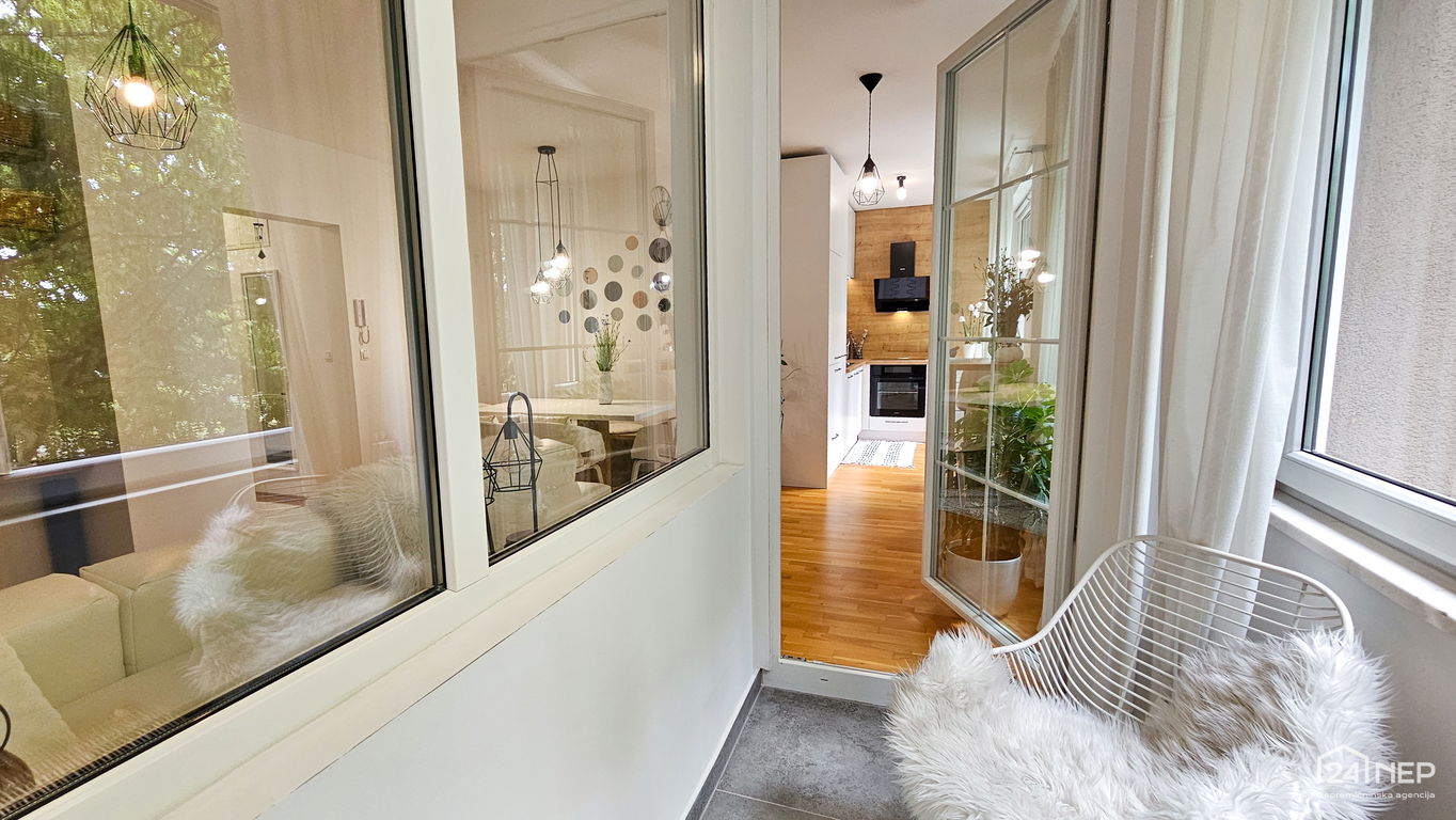 Čudovito 2-sobno stanovanje odlikuje svetla južna lega in veliko steklenih površin, ki jih krasijo zunanje krošnje dreves. Popolnoma obnovljeno in po meri izdelano pohištvo ter naravni materiali dajejo občutek uglašenosti in mirnosti.