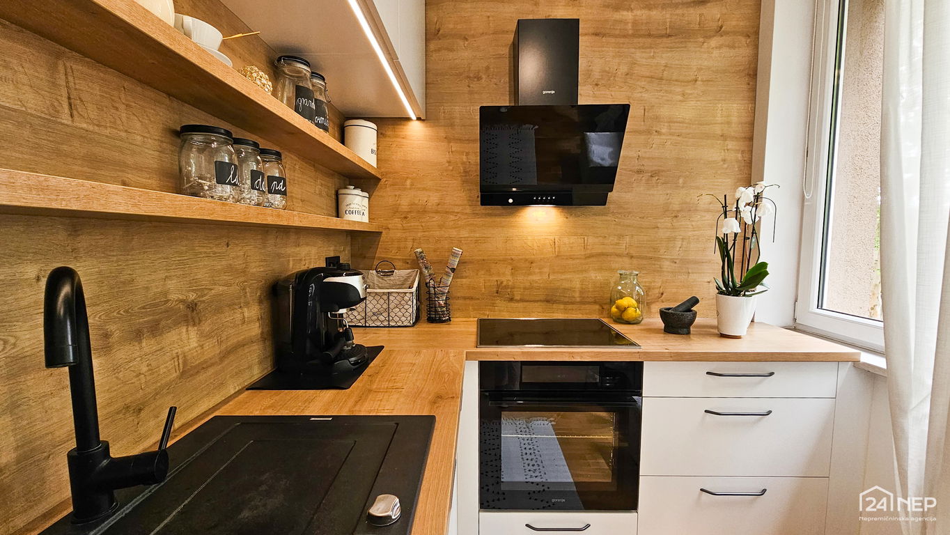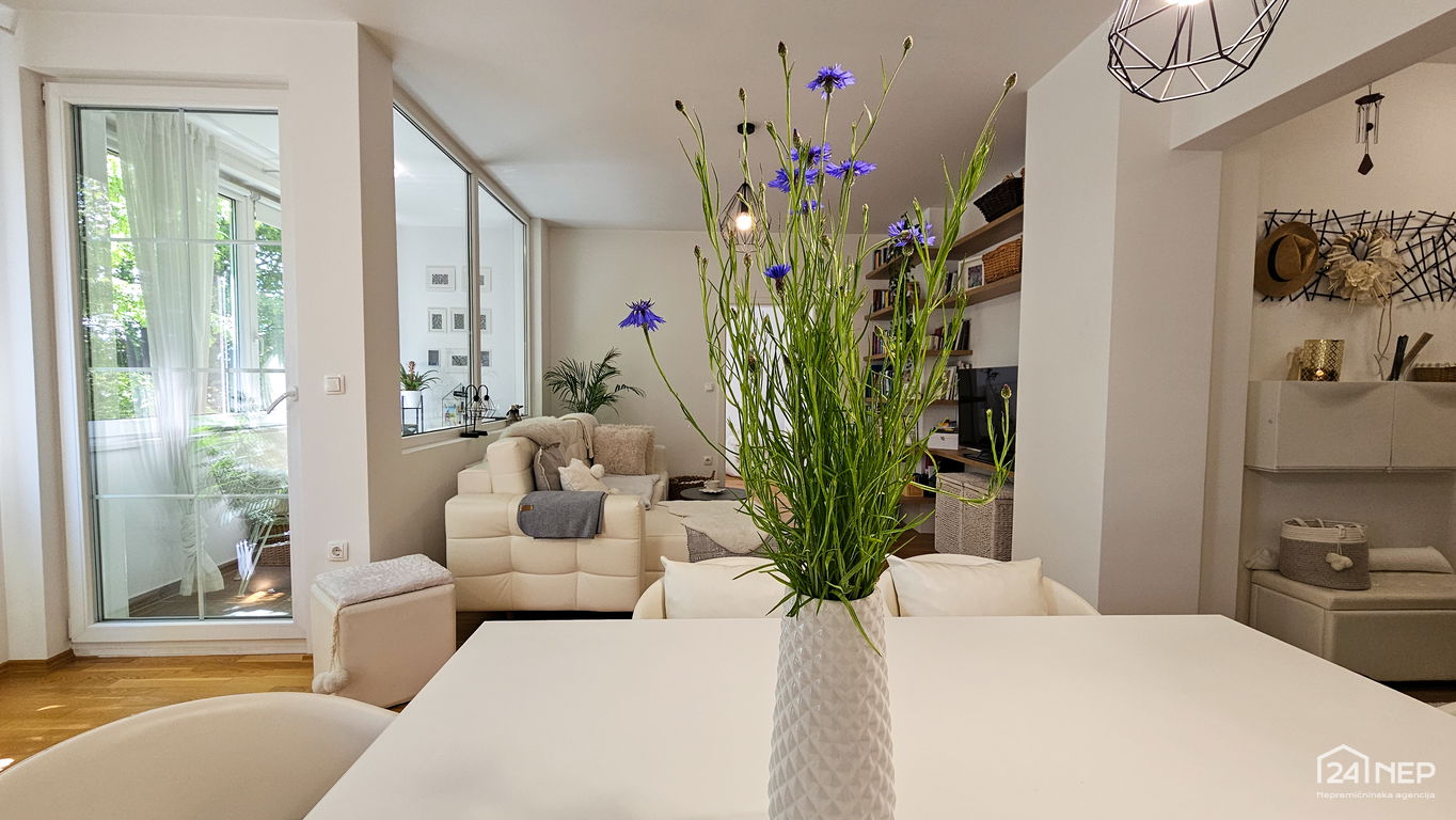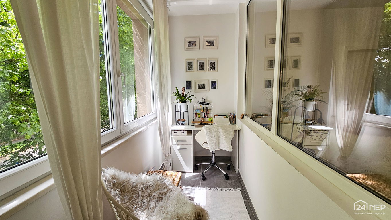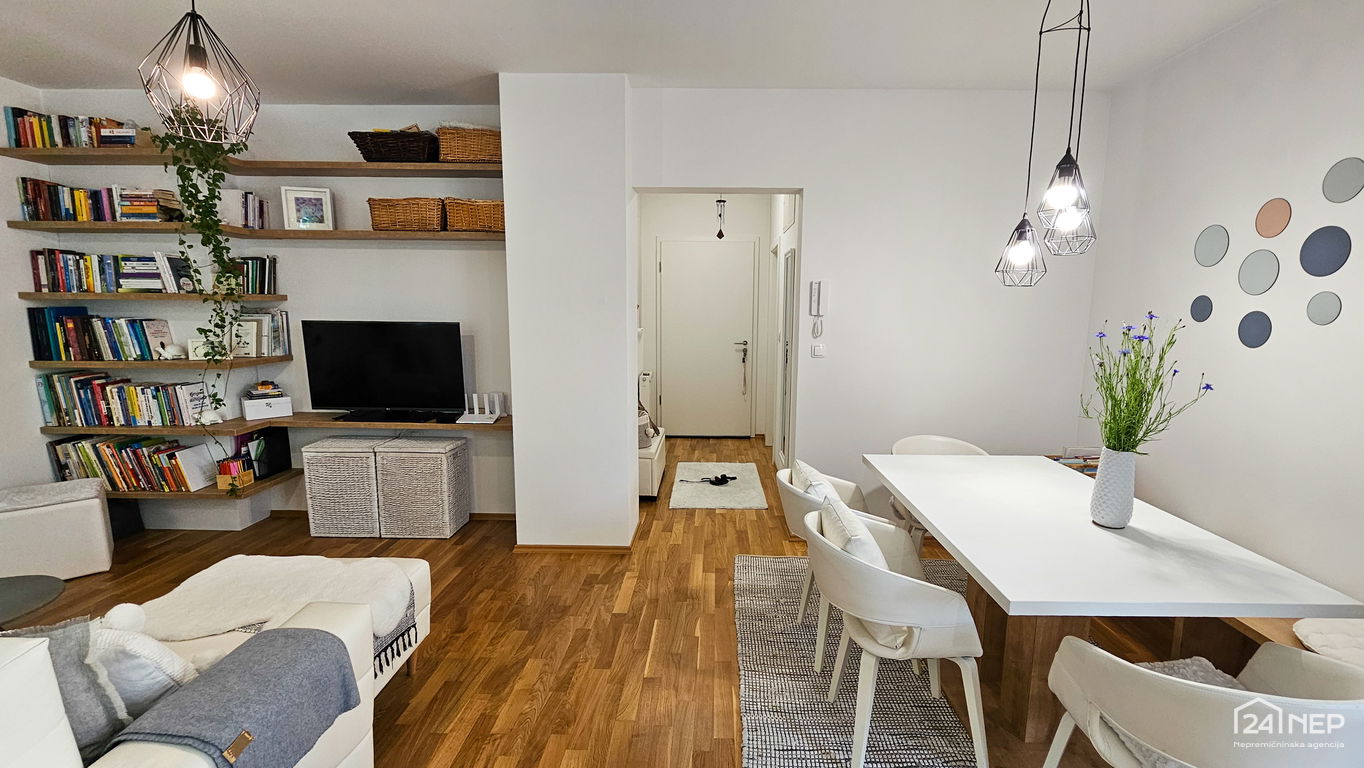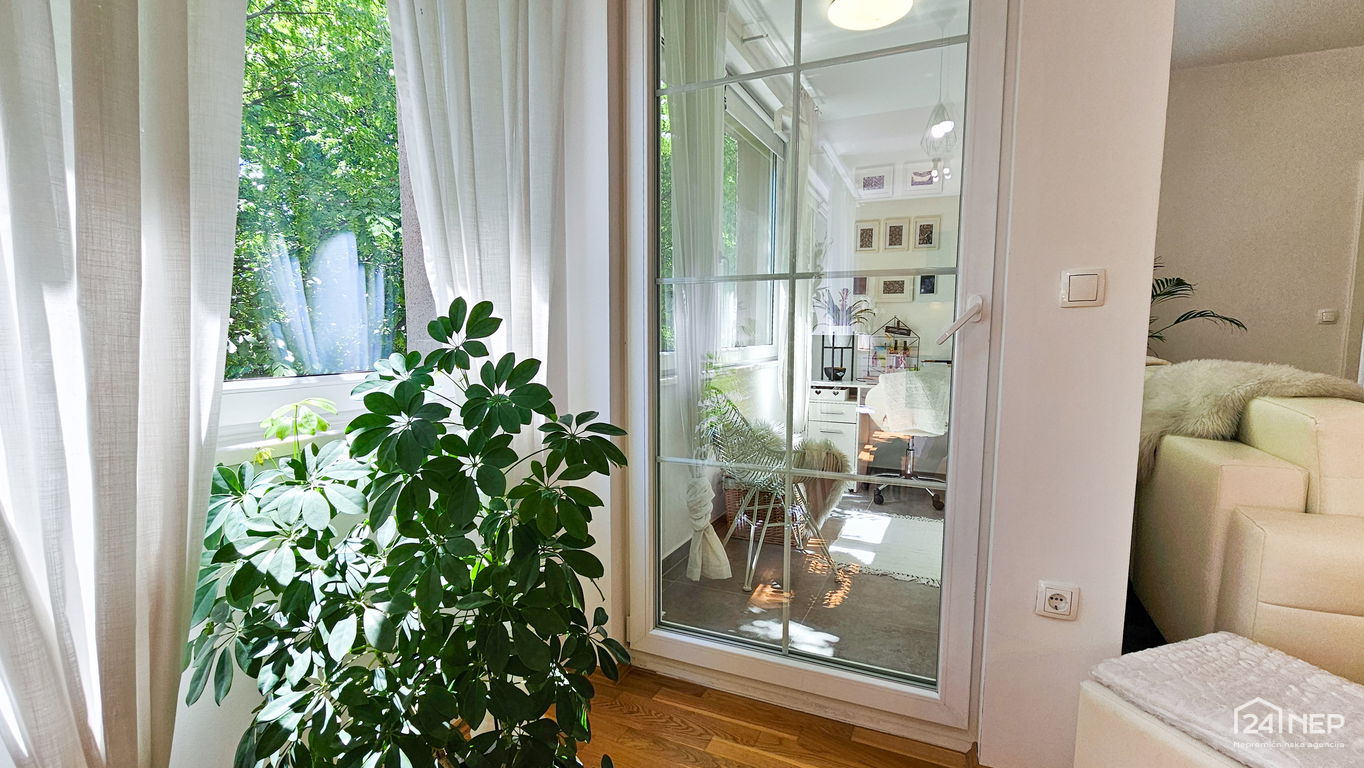 Čudovito 2-sobno stanovanje odlikuje svetla južna lega in veliko steklenih površin, ki jih krasijo zunanje krošnje dreves. Popolnoma obnovljeno in po meri izdelano pohištvo ter naravni materiali dajejo občutek uglašenosti in mirnosti.