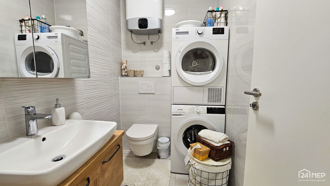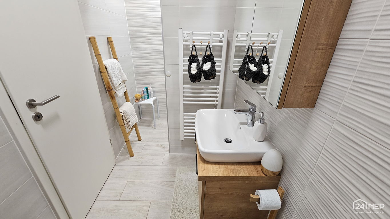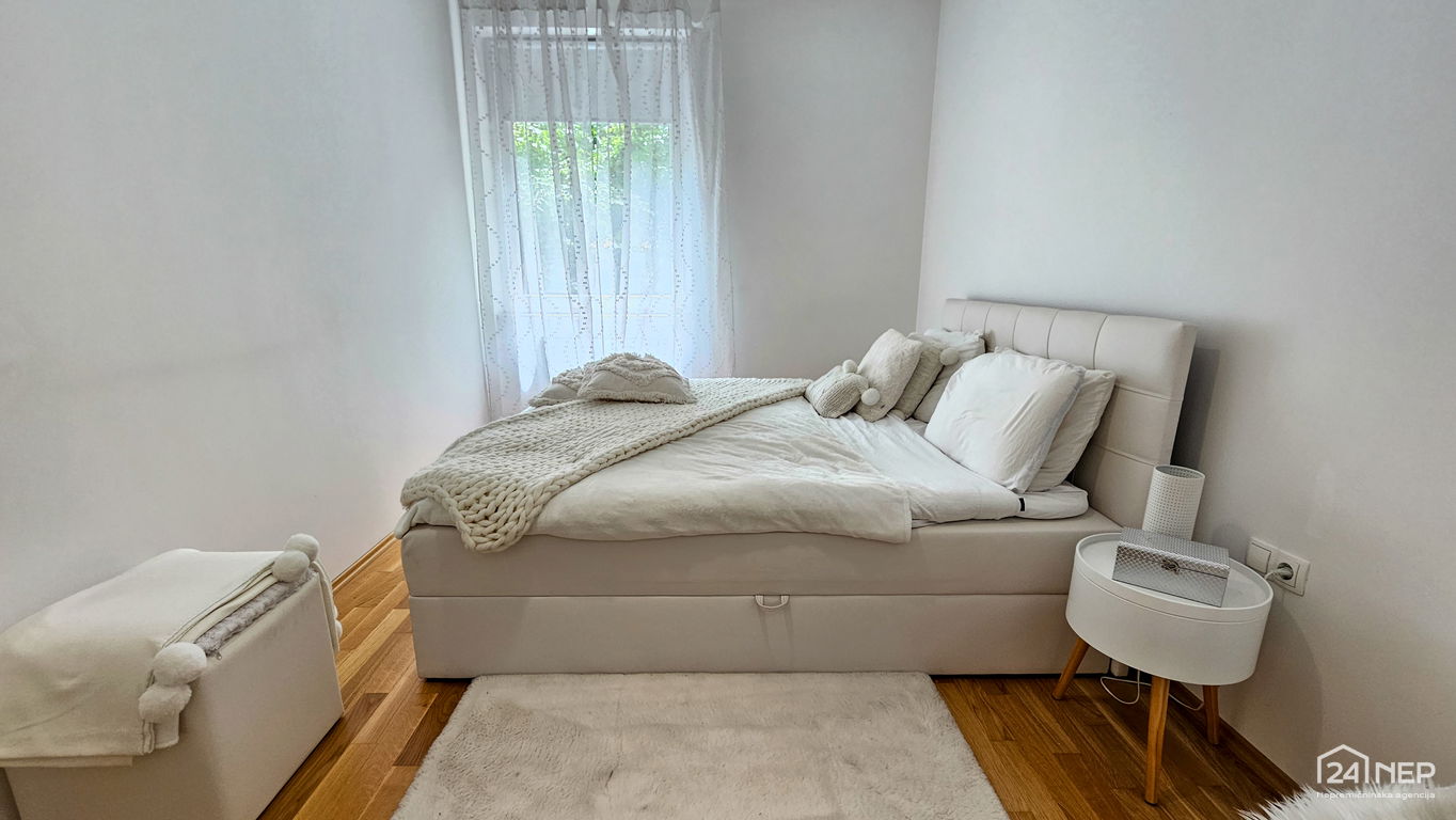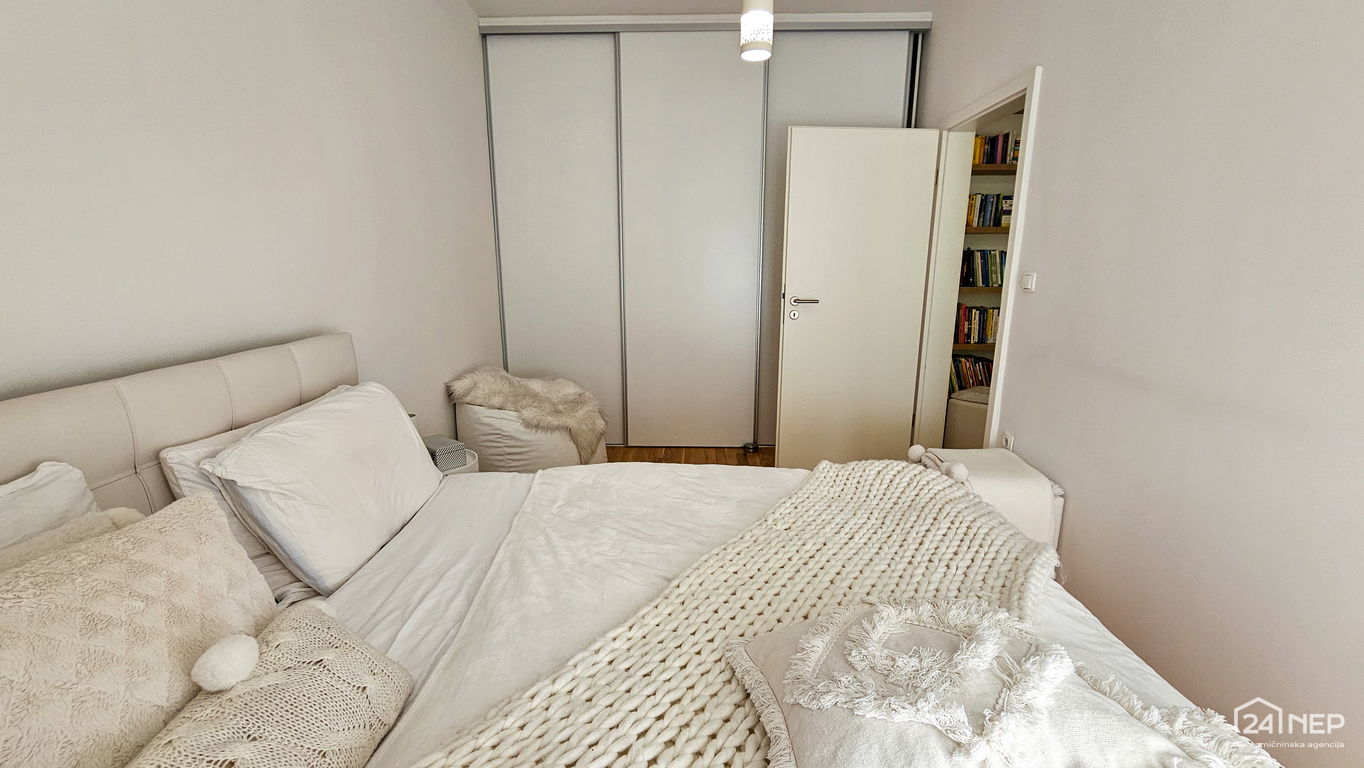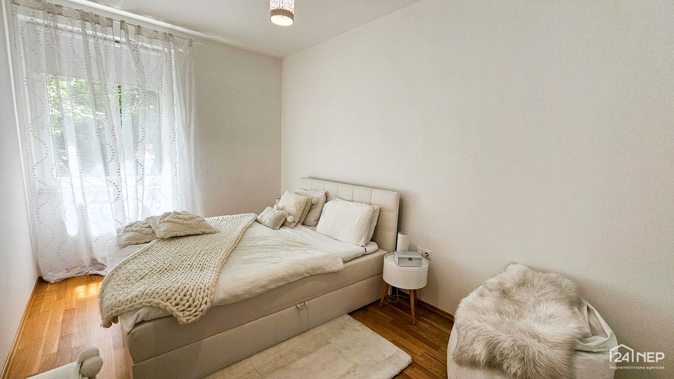Čudovito 2-sobno stanovanje odlikuje svetla južna lega in veliko steklenih površin, ki jih krasijo zunanje krošnje dreves. Popolnoma obnovljeno in po meri izdelano pohištvo ter naravni materiali dajejo občutek uglašenosti in mirnosti.