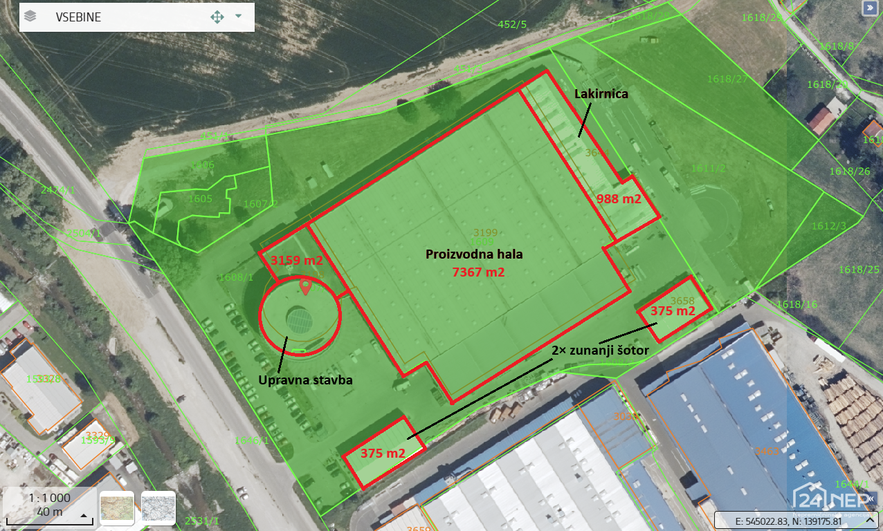 Na prodaj je popolnoma opremljen proizvodno-pisarniški kompleks s stroji vključenimi v ceno. Pripravljen za takojšen zagon poslovanja. Gre za bivši obrat za gradbeništvo in industrijsko serijsko proizvodnjo. Skupne notranje površine znašajo 11.890 m2, medtem ko vsa zemljišča skupaj merijo 32.899 m2.