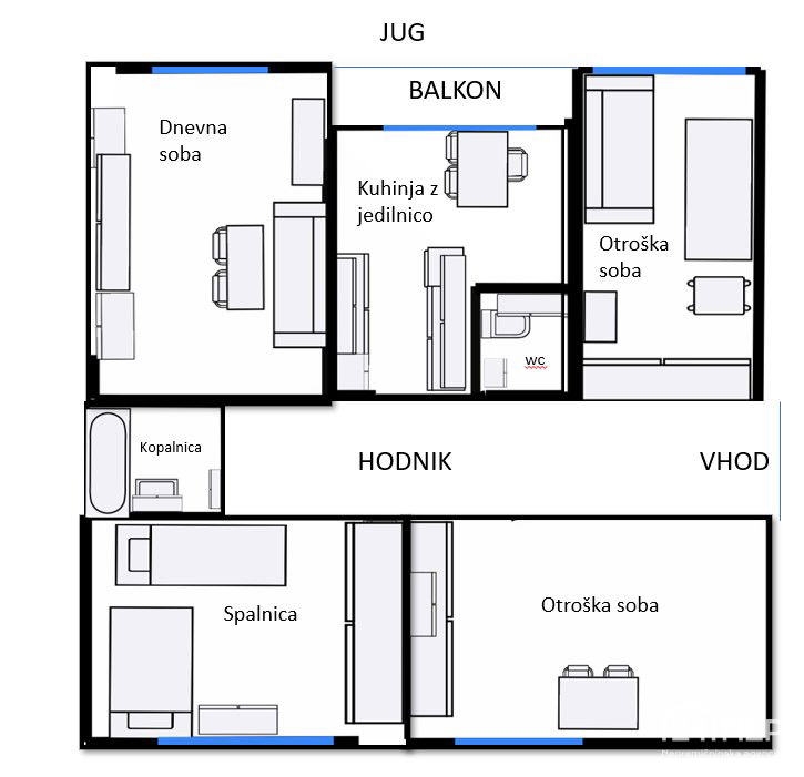 Notranjost je funkcionalno zasnovana, s prostornimi in zračnimi sobami, ki ustvarjajo občutek topline in domačnosti. Velika dnevna soba s prijetno južno lego, kuhinja z jedilnico in tri ločene spalnice ponujajo prijetno bivanje tudi za večjo družino. Stanovanje je takoj vseljivo in idealno za družine, pare ali posameznike, ki cenijo kakovostno življenje v bližini centra mesta.