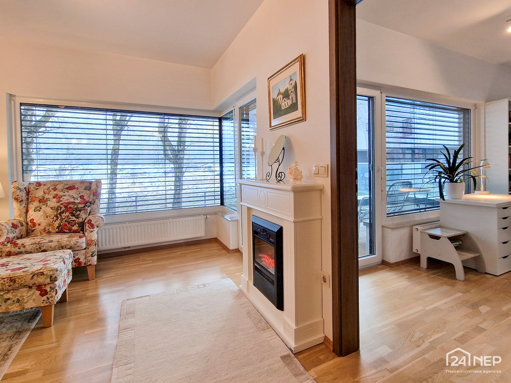 Velike steklene površine ter visok strop poskrbijo, da je stanovanje še posebej svetlo in polno naravne svetlobe.