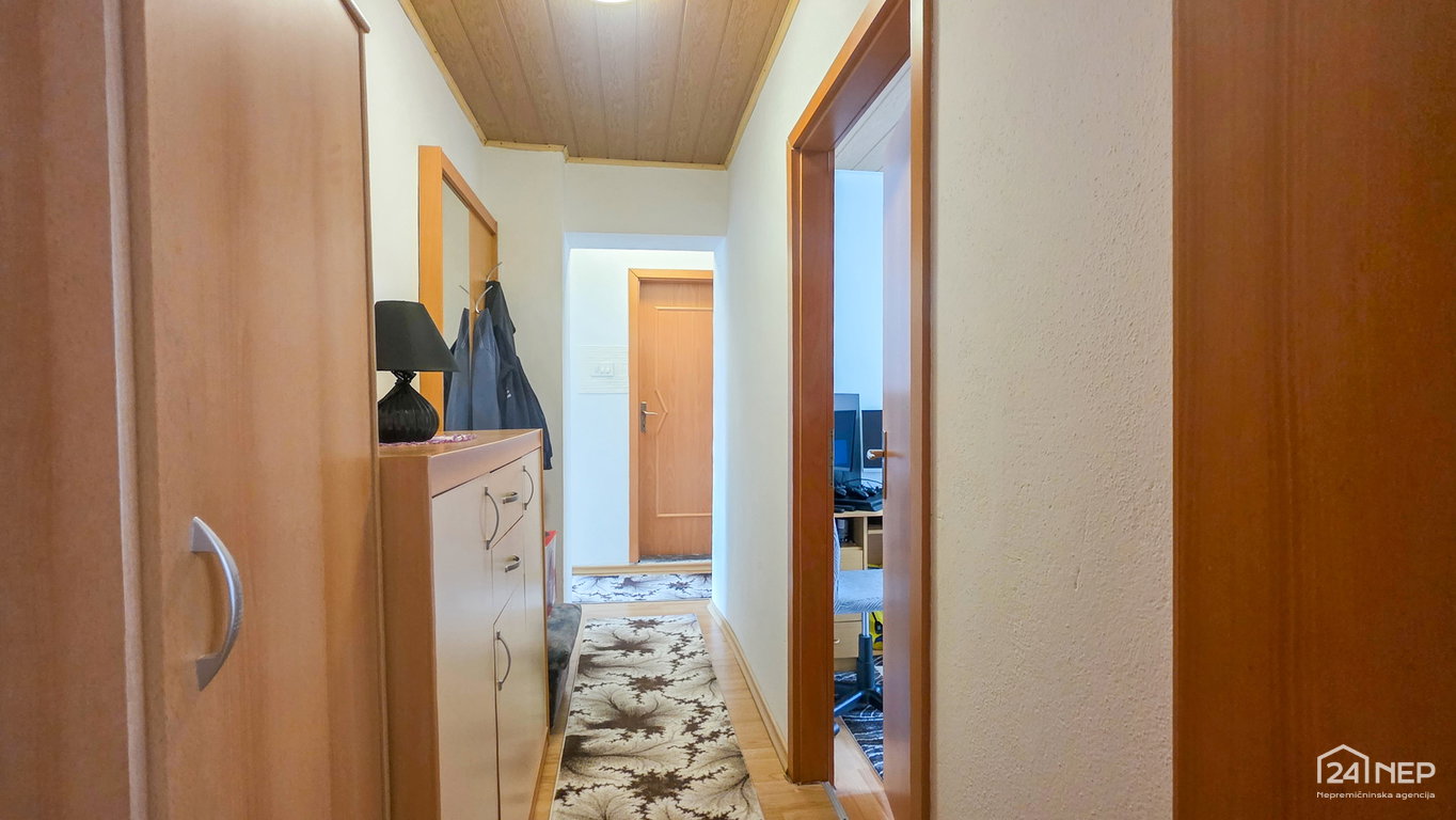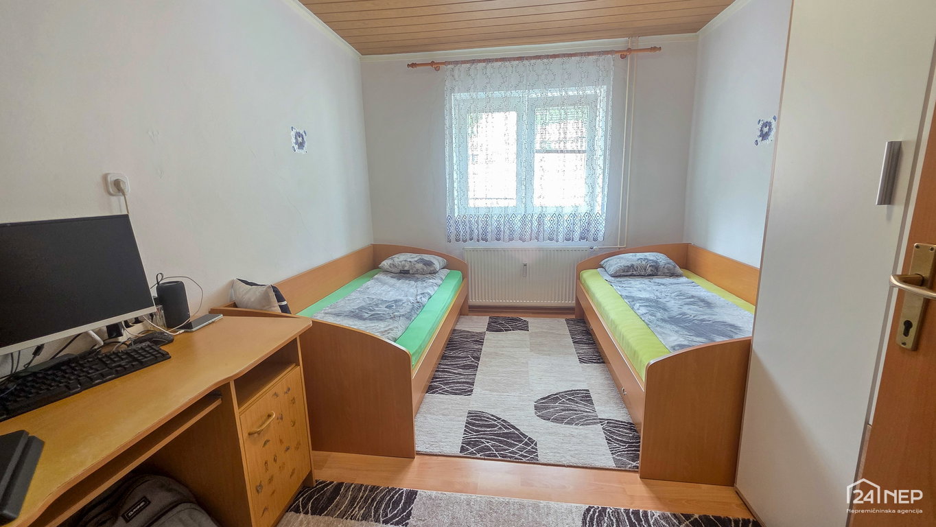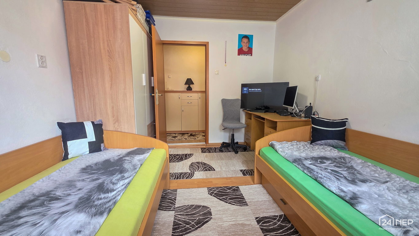 razporeditev: predsoba/loža, kuhinja z jedilnico in dnevno sobo, dve spalnici, otroška soba in kopalnica z WC-jem.