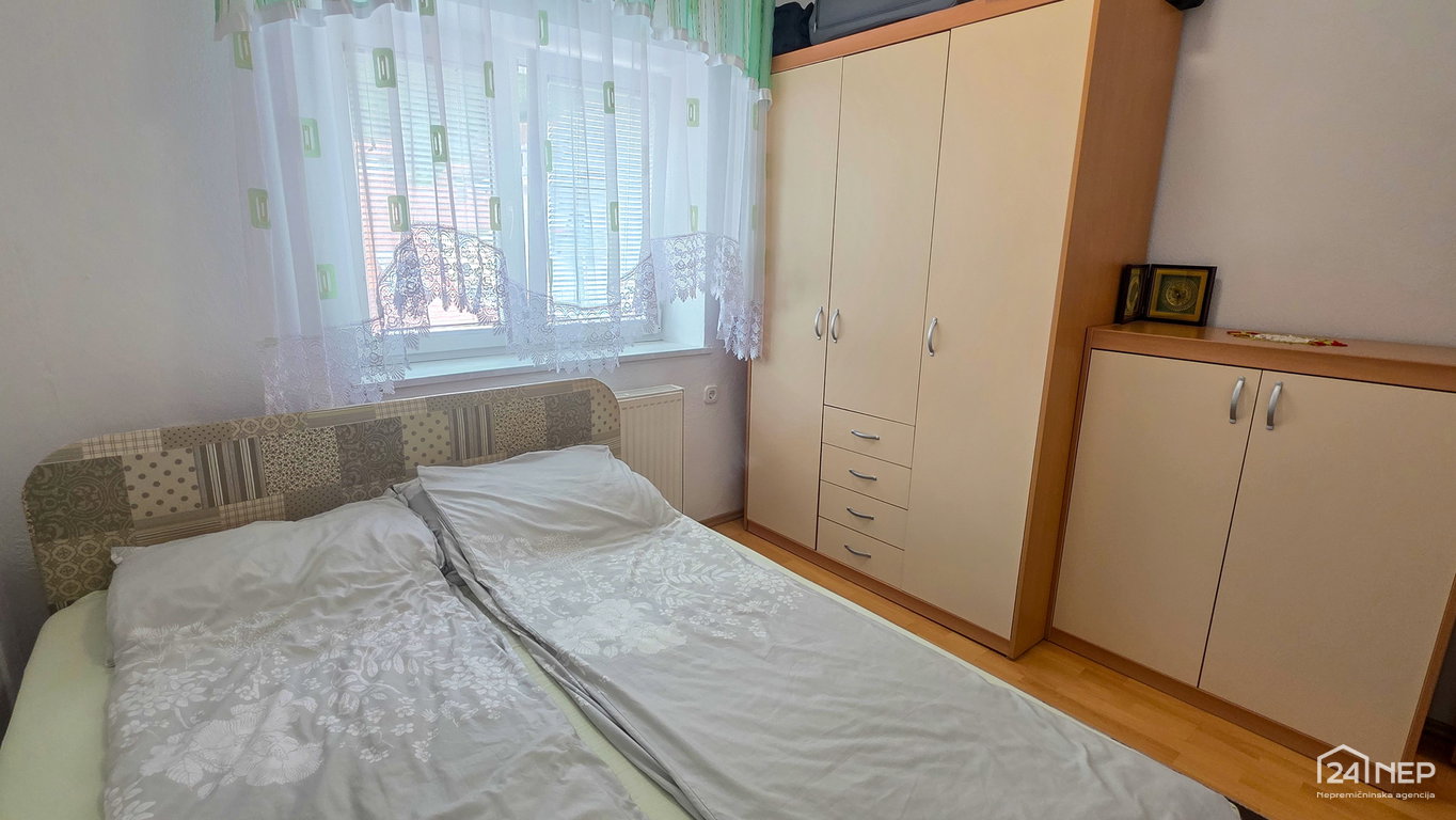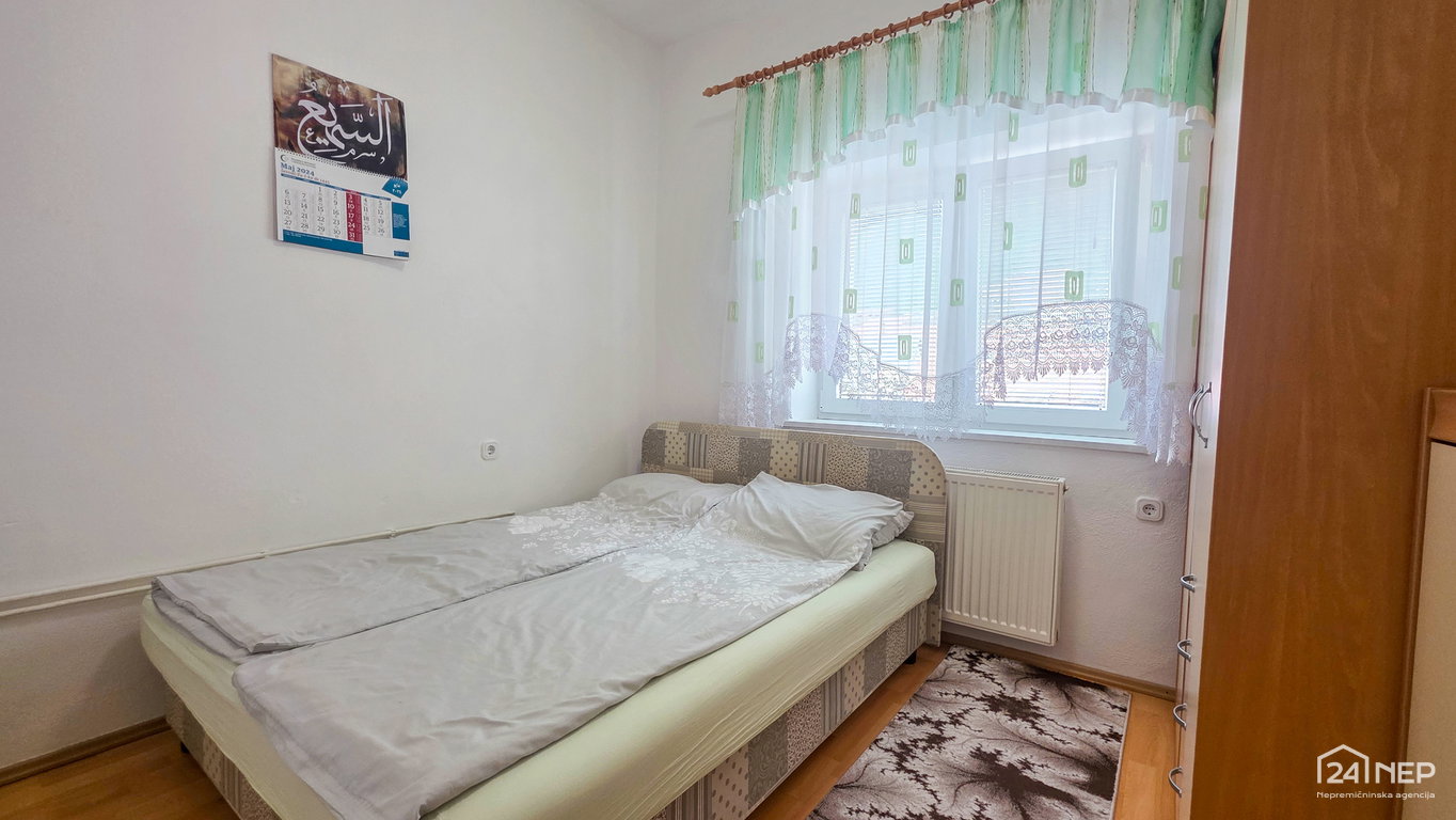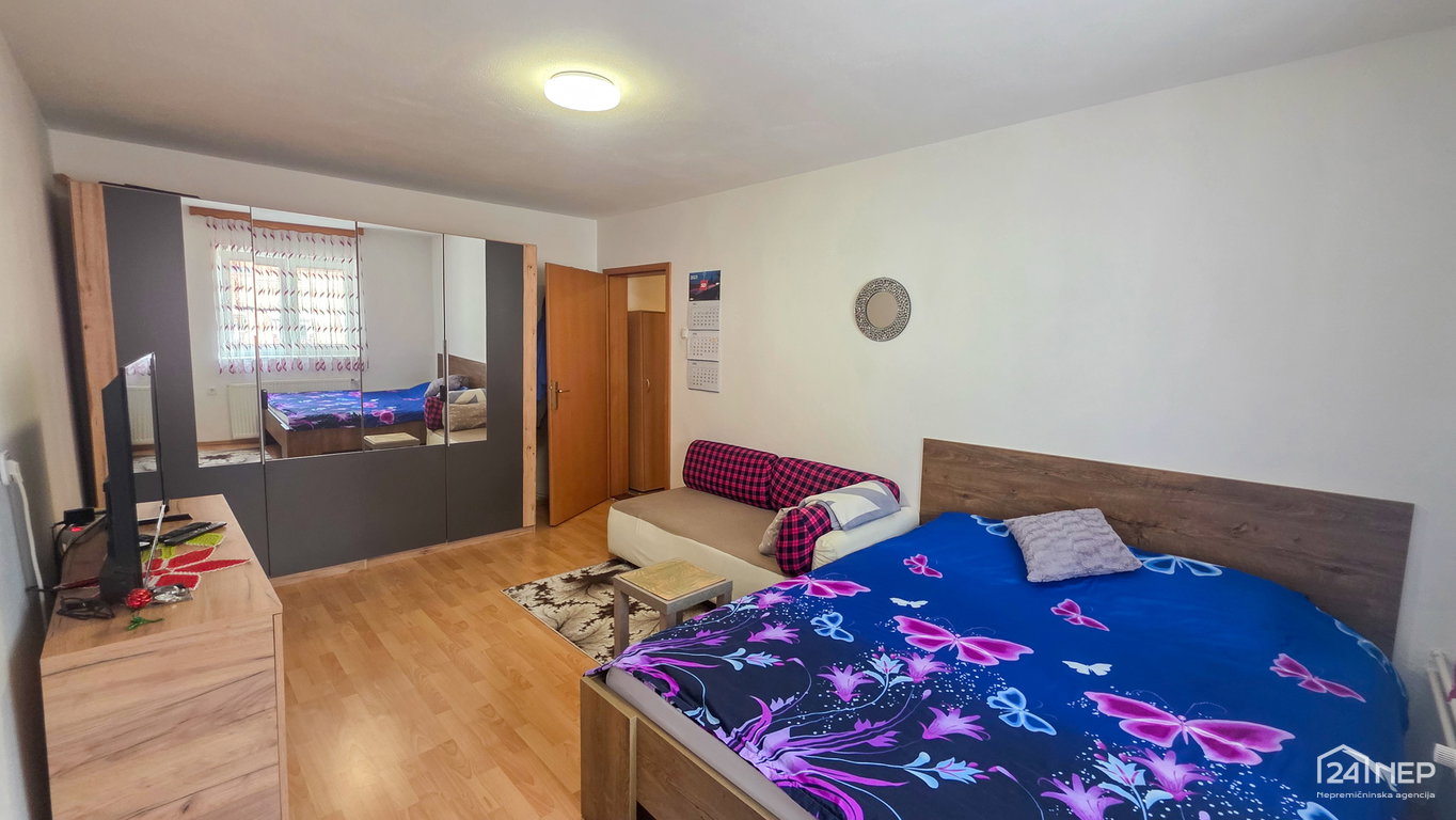 razporeditev: predsoba/loža, kuhinja z jedilnico in dnevno sobo, dve spalnici, otroška soba in kopalnica z WC-jem.