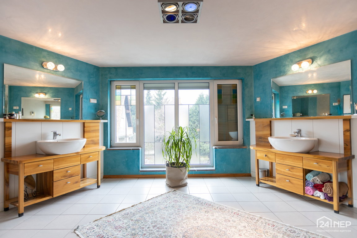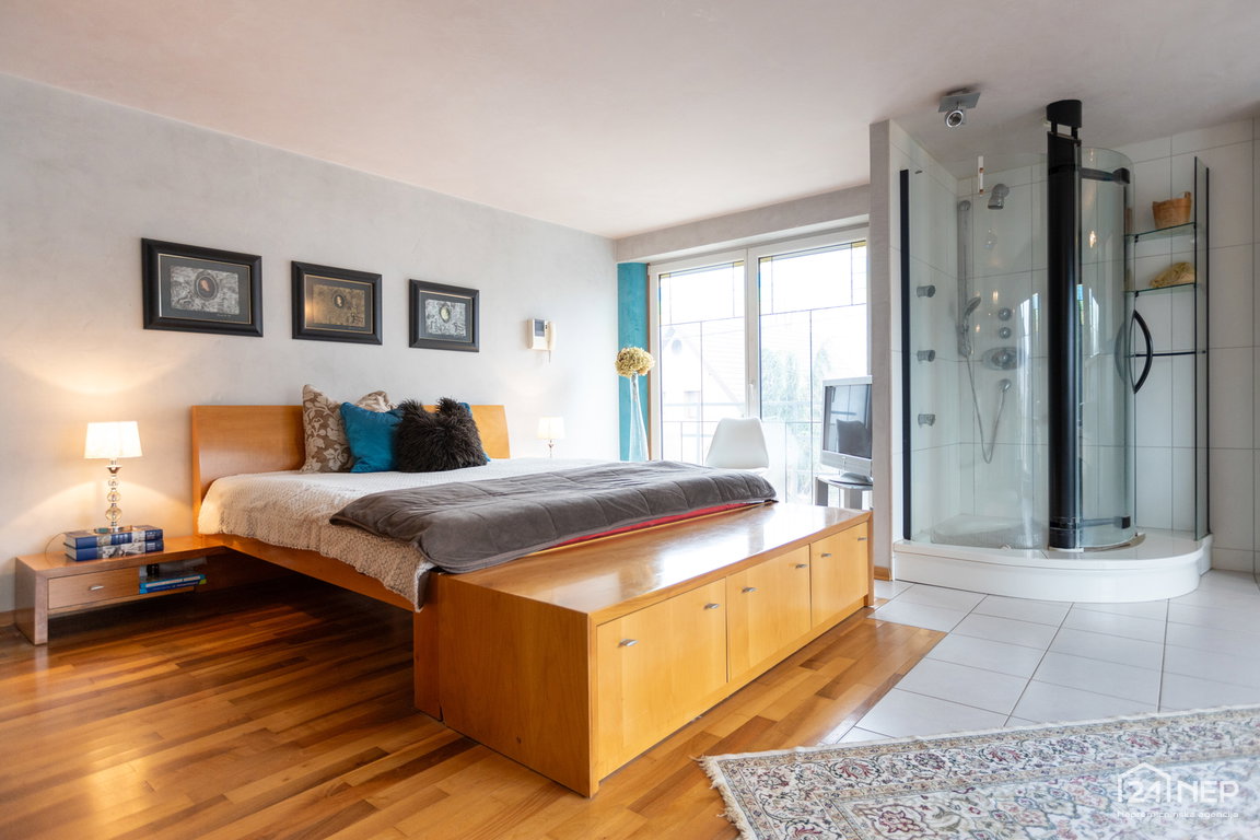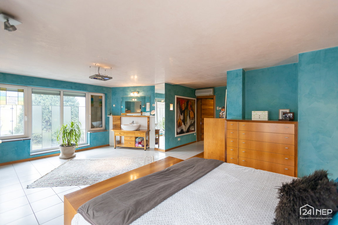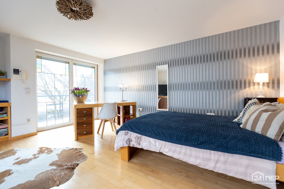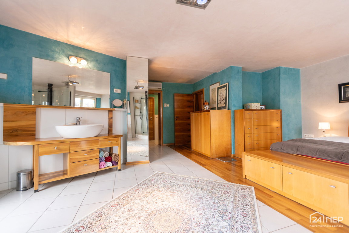 Glavna spalnica z lastno kopalnico in garderobno sobo ter otroška soba z lastno kopalnico in garderobo. Razporeditev zagotavlja zasebnost in udobje za vse člane gospodinjstva.