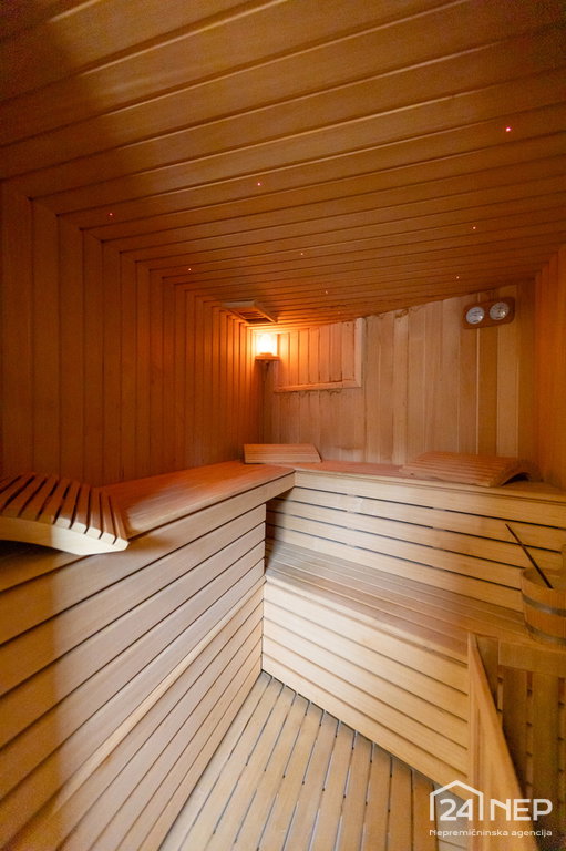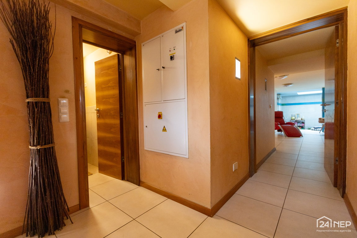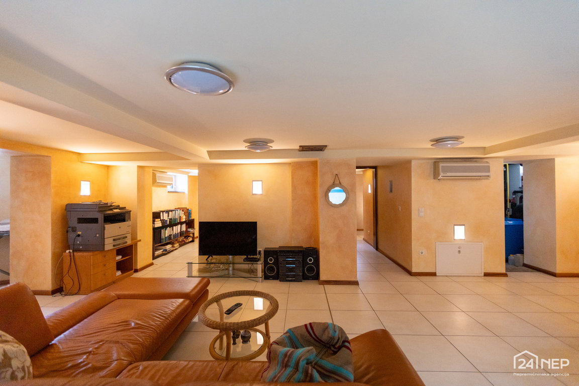 Finska savna, turška savna, prostor za tuširanje, pisarna, shramba, WC in kotlovnica. Kletna etaža omogoča ureditev zasebnega wellnessa ali mirnega delovnega okolja.