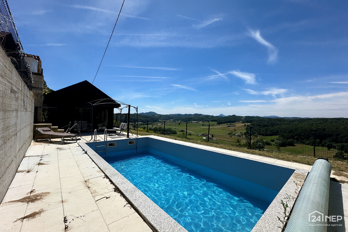 Na prodaj je prijetna samostojna hiša z bazenom in letno hiško, ki ponuja odlično priložnost za udobno bivanje v objemu narave ali za oddajanje v turistične namene.