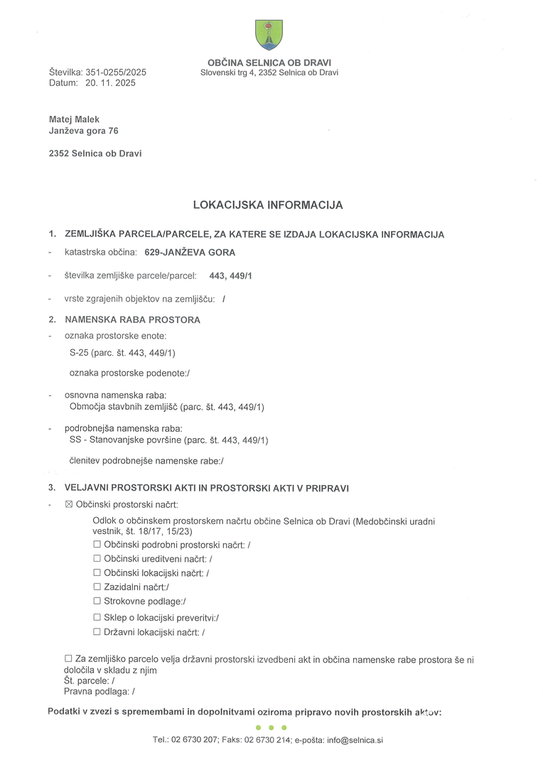 Janževa Gora 76, Selnica ob Dravi: Prodamo zazidalno zemljišče v velikosti 735 m2, ki je po namembnosti zavedeno kot stanovanjska površina. Glavni prednosti sta neposredna bližina Selnice ob Dravi s vso pripadajočo infrastrukturo (za dodatne informacije glejte lokacijsko informacijo).