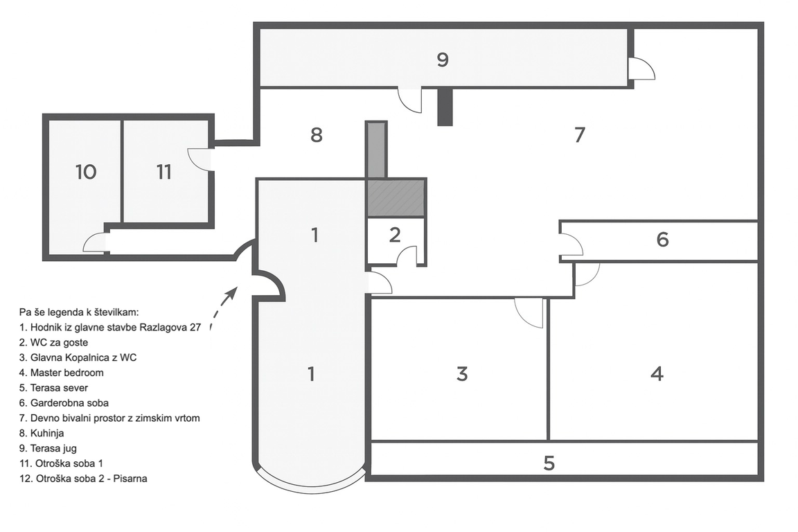- Razporeditev: predsoba, ločen WC, kopalnica, garderoba, spalnica - terasa sever, dnevno-bivalni prostor z jedilnico, kuhinja, terasa - jug, hodnik, otroška soba 1, otroška soba 2.