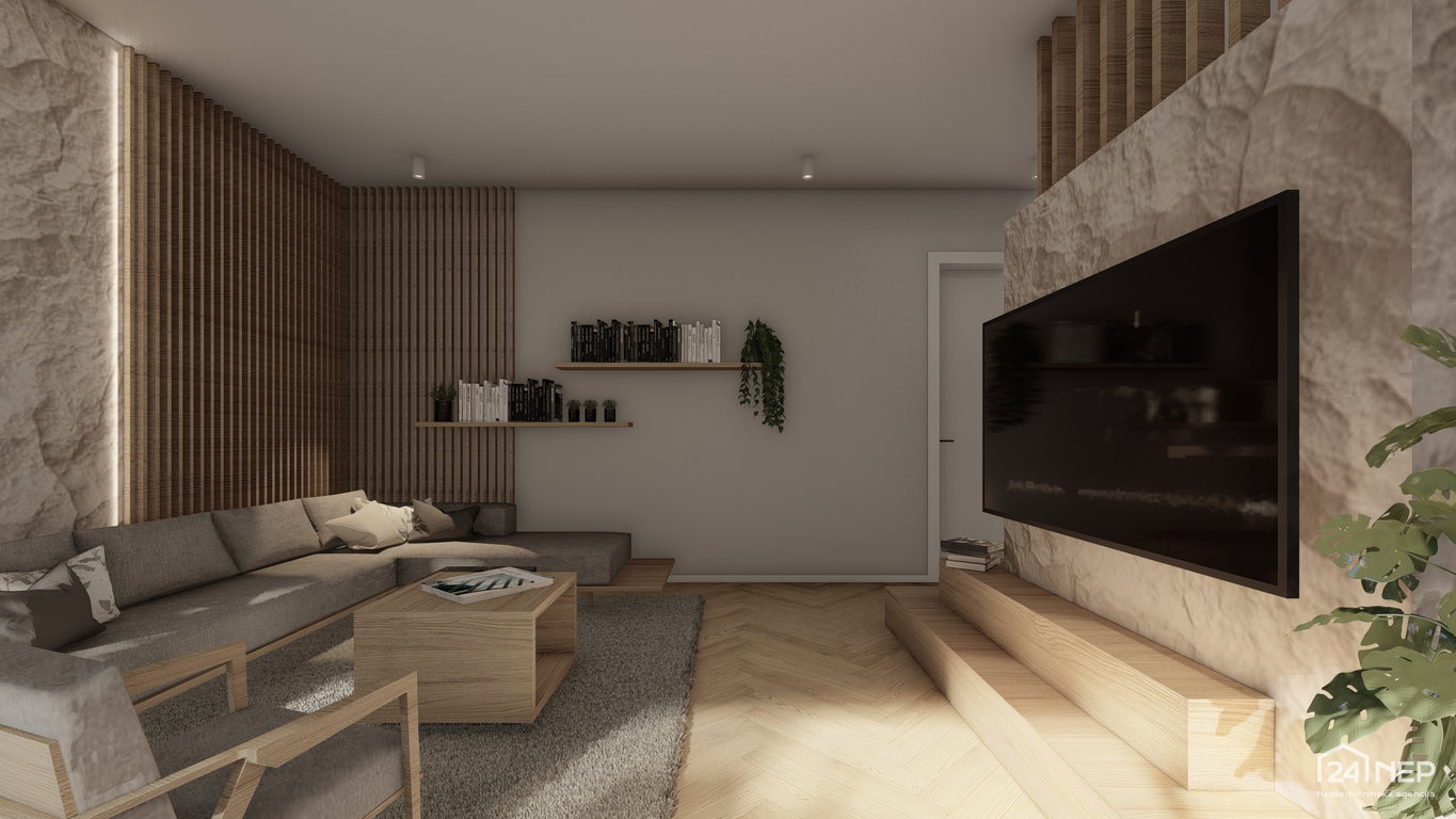 - Prostoren in svetel dnevni prostor s kuhinjo in jedilnico ter izhodom na teraso in zelenico 43,10 m2