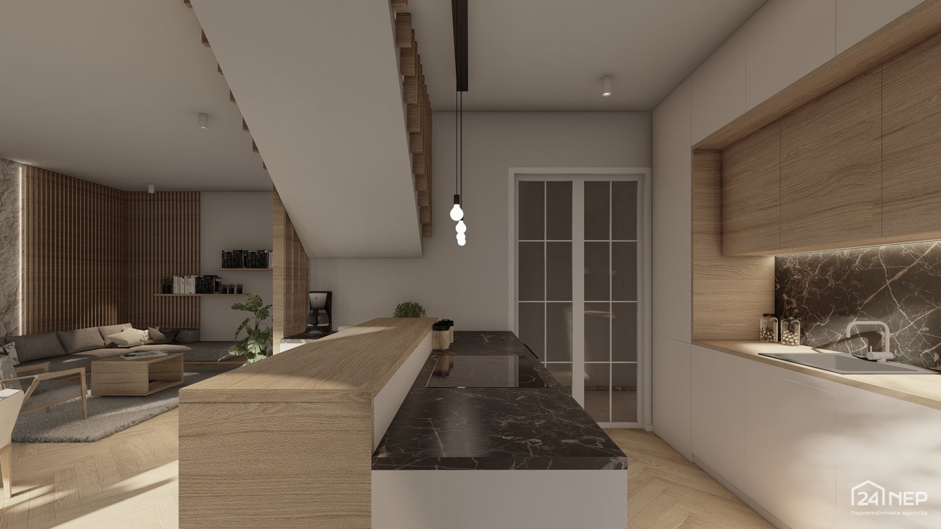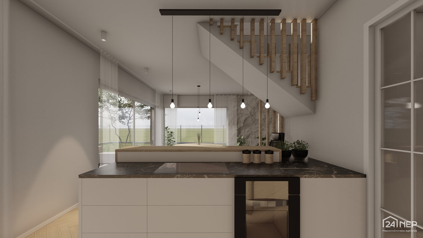 - Prostoren in svetel dnevni prostor s kuhinjo in jedilnico ter izhodom na teraso in zelenico 43,10 m2