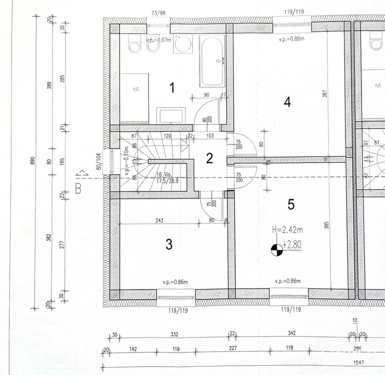 Nadstropje: hodnik s stopniščem, kopalnica, spalnica, soba 1, soba 2