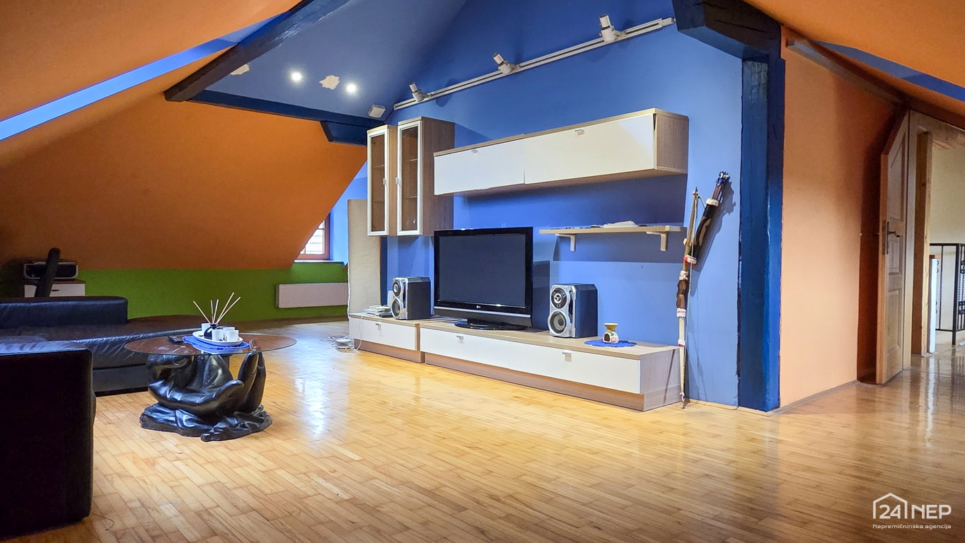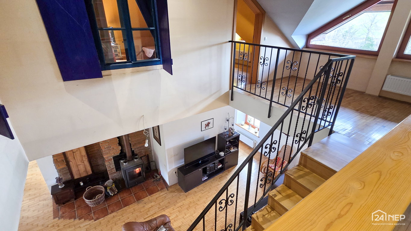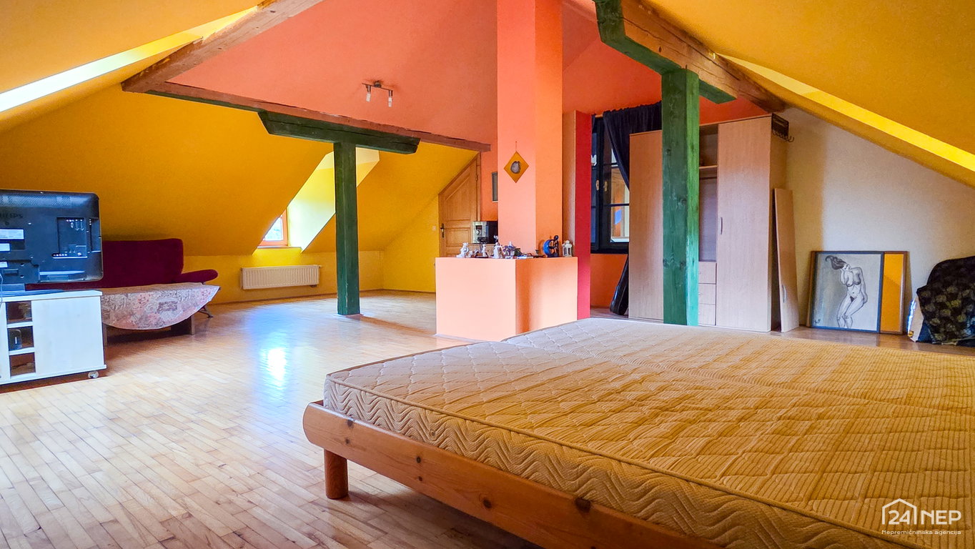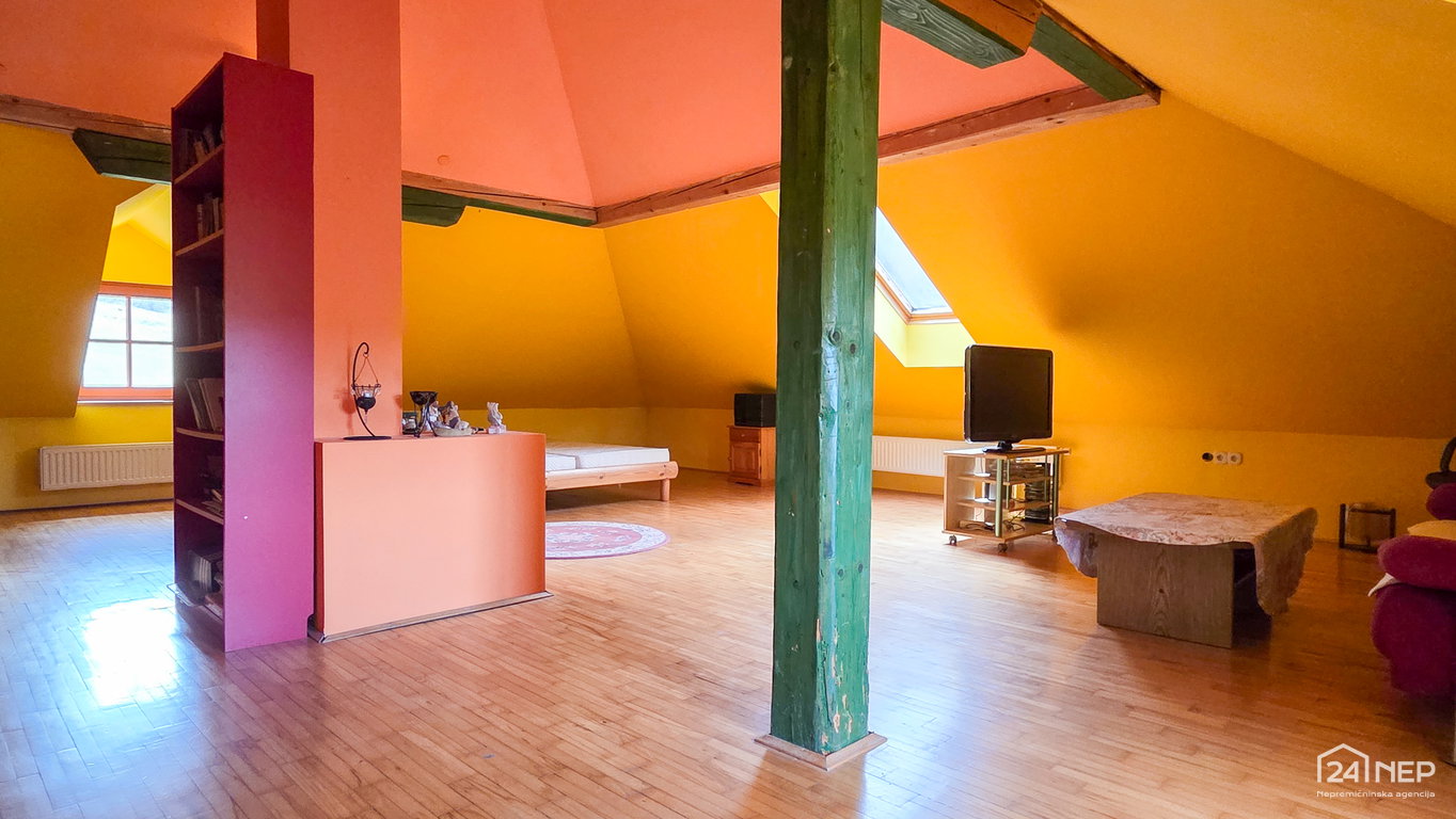 • Mansarda: stopnišče, hodnik, kopalnica z WC, vzhodno krilo - velik bivalen prostor z izhodom na teraso, zahodno krilo – velik bivalen prostor.