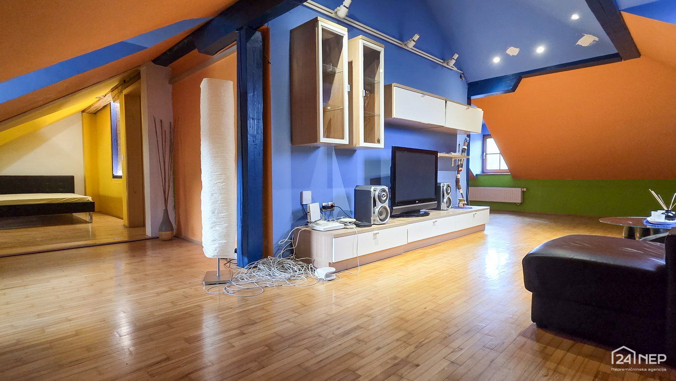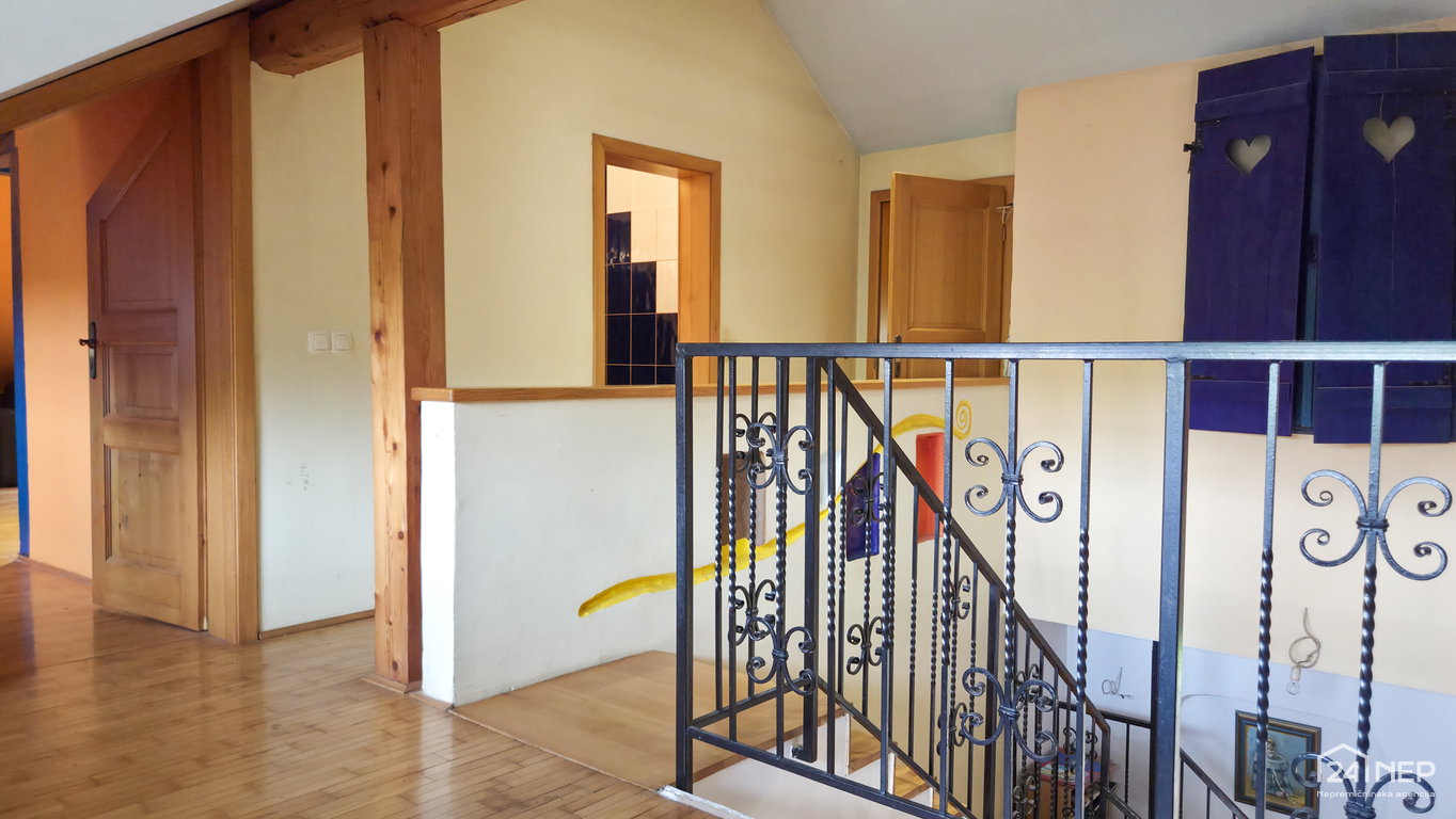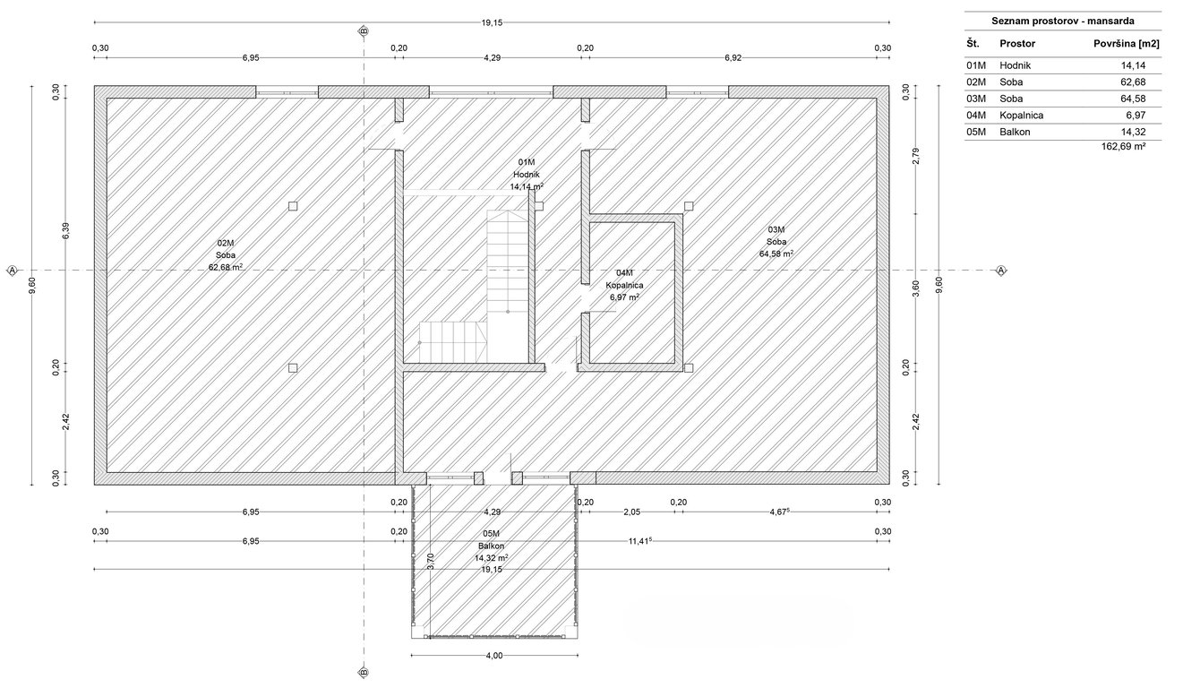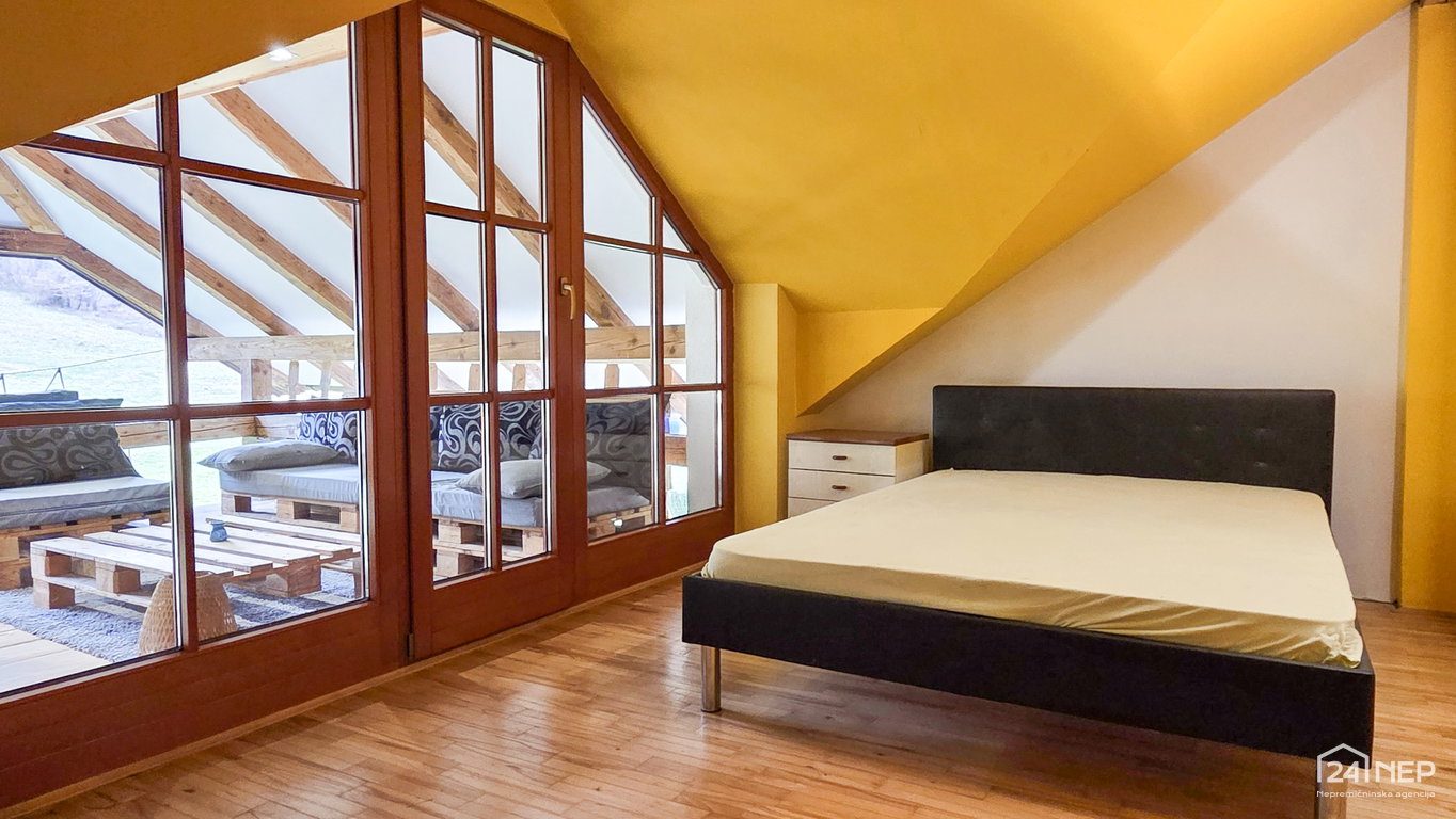 • Mansarda: stopnišče, hodnik, kopalnica z WC, vzhodno krilo - velik bivalen prostor z izhodom na teraso, zahodno krilo – velik bivalen prostor.