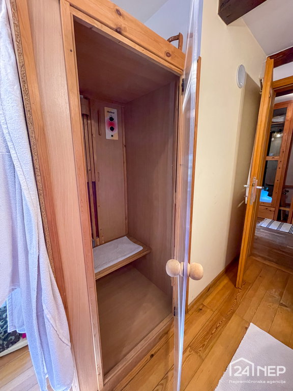 Predprostor, hodnik, kuhinja z jedilnico, dnevna soba, dodatna soba, kopalnica (masažna kad in infrardeča savna), wc