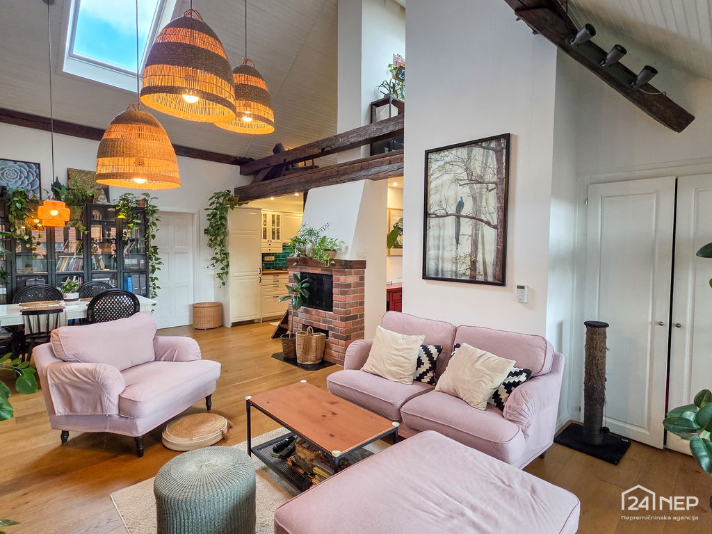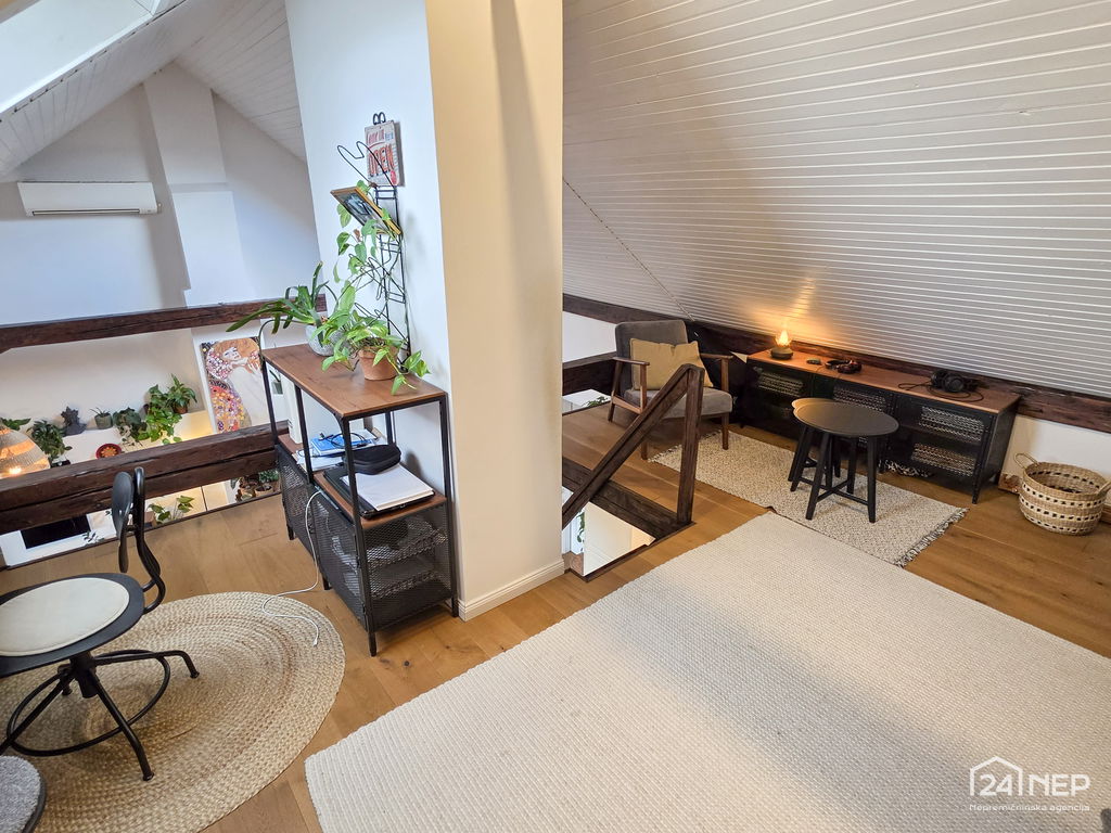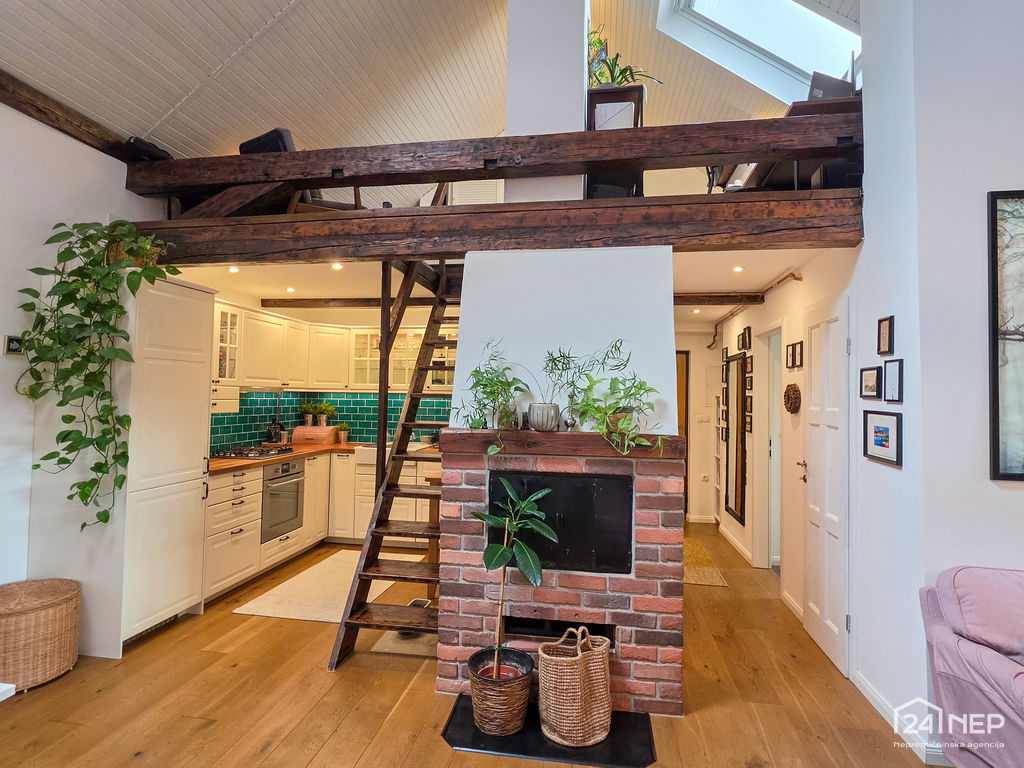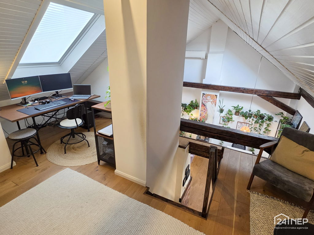Prostoren in svetel dnevni del ustvarja občutek svobode, dodatna galerija pa ponuja popoln kotiček za delo, ustvarjanje ali sproščanje. Visoki stropi in premišljena razporeditev prostorov poudarjajo zračnost stanovanja, medtem ko strešna okna v prostor vabijo obilico naravne svetlobe.