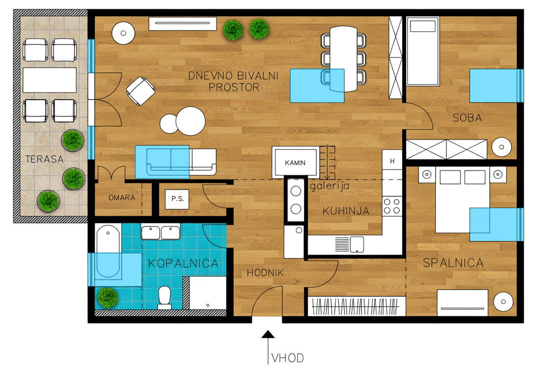 Razporeditev: hodnik, spalnica, kopalnica, shramba (p.s.), velik dnevno bivalni prostor z kuhinjo, jedilnico ter dnevno dobo od koder je izhod na pokrito teraso, otroška soba. Ob kuhinji so stopnice, ki vodijo v galerijo kjer je dodaten velik prostor za delo/sproščanje/počitek ali igro.