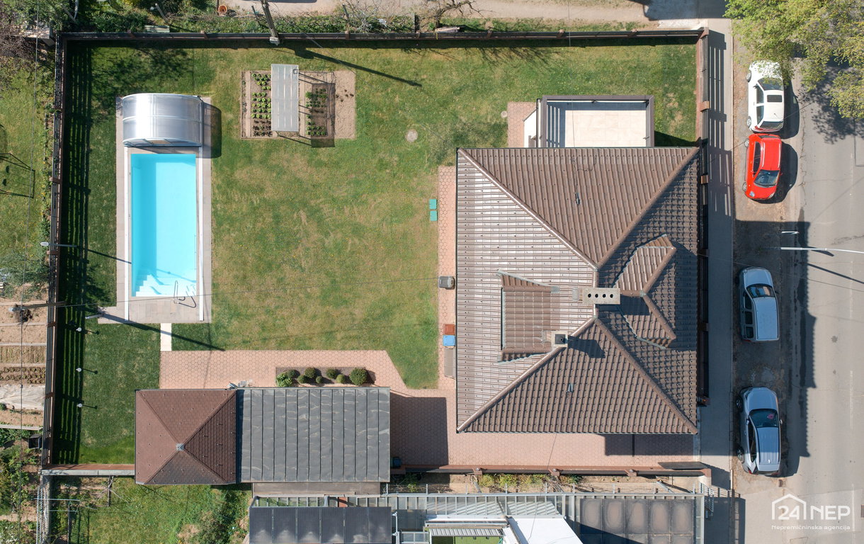 Ob hiši se nahaja garaža, grajena leta 2003, ki se v podaljšku nadaljuje v letno kuhinjo ob bazenu.