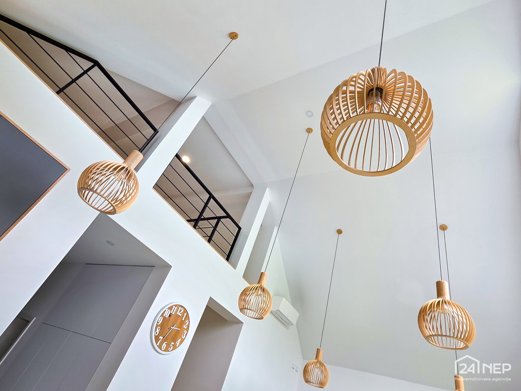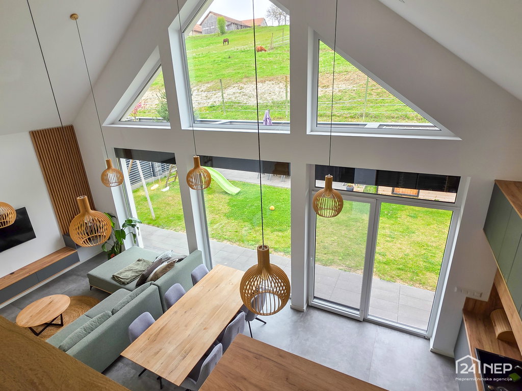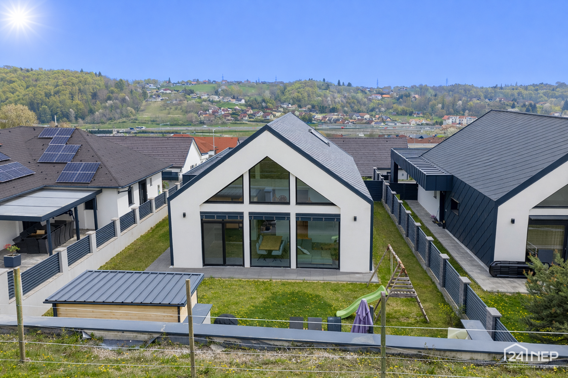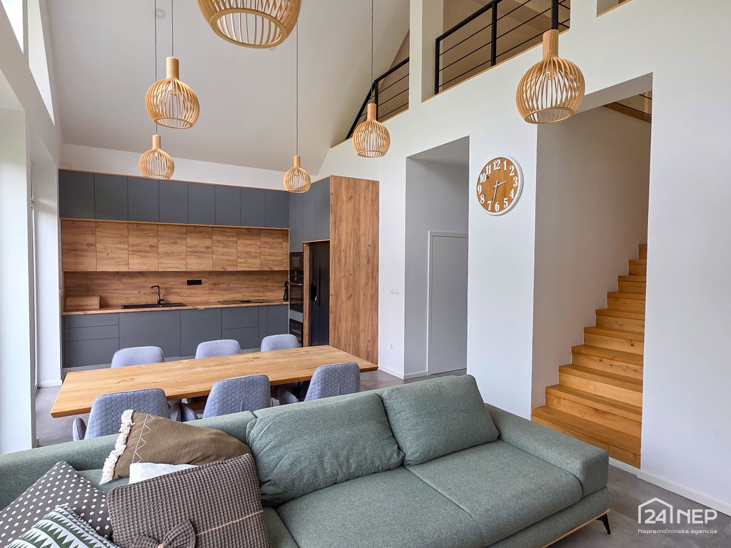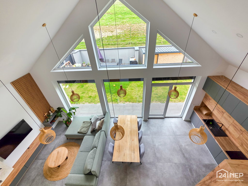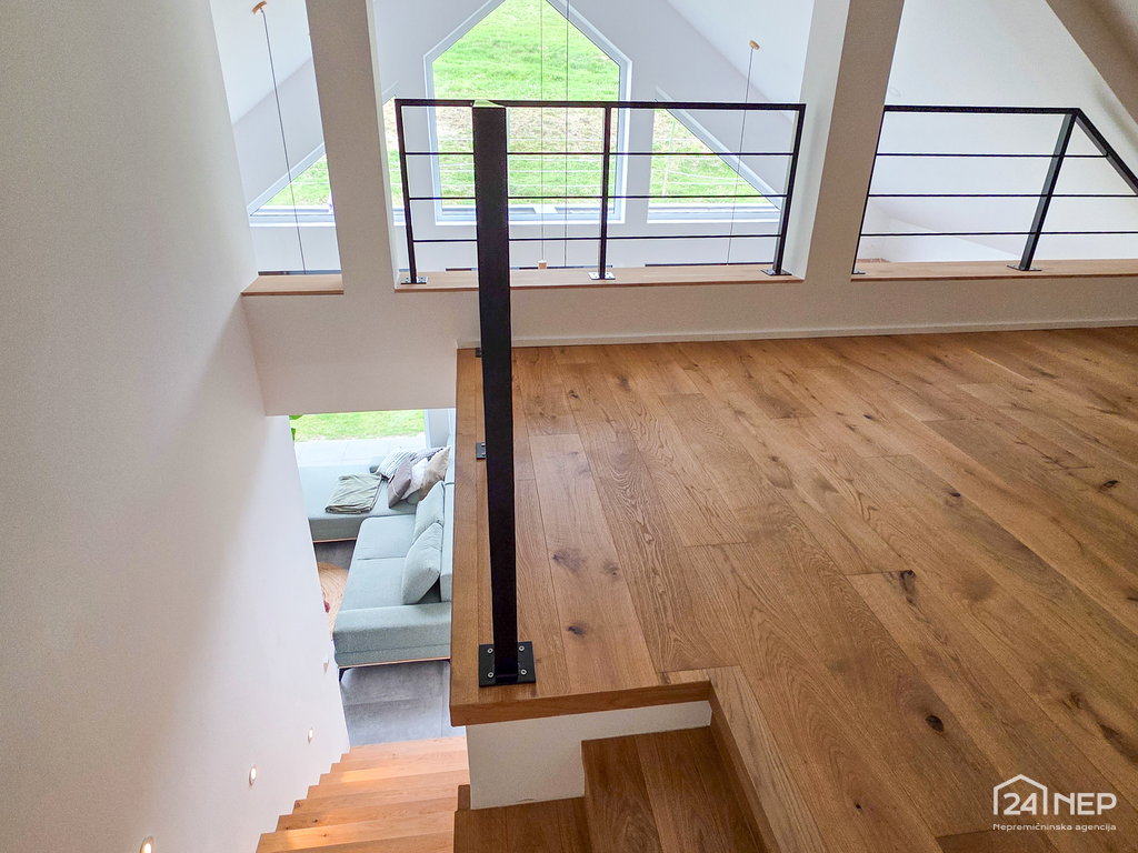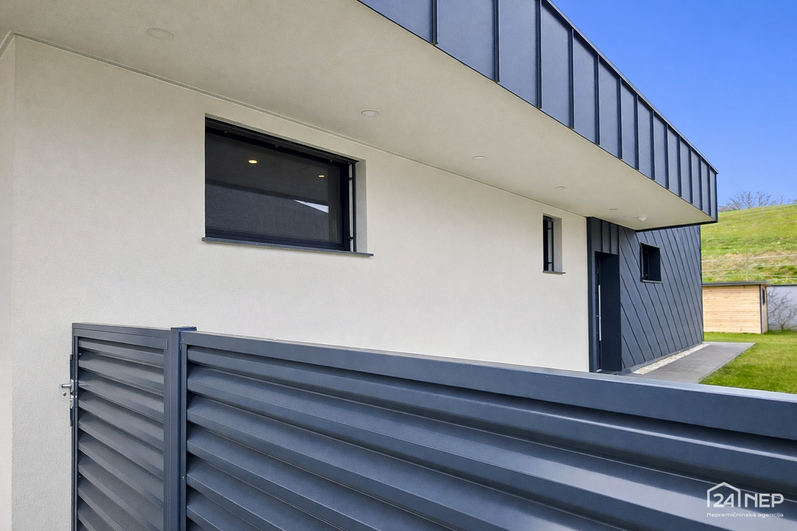 Hiša ponuja sodoben in funkcionalen tloris z izrazitim občutkom prostornosti, ki ga dodatno poudari galerija in višji stropovi. Vgrajeni materiali, oprema po meri in tehnične rešitve zagotavljajo kakovostno bivanje brez kompromisov. Zunanjost z letno kuhinjo in urejeno okolico omogoča prijetno preživljanje prostega časa v zasebnosti. Gre za celostno dovršen dom, primeren za tiste, ki iščejo kombinacijo arhitekturne čistosti, udobja in mirne lokacije z dobro dostopnostjo.