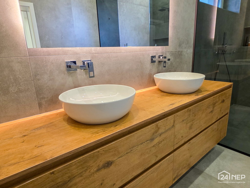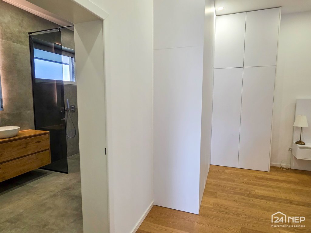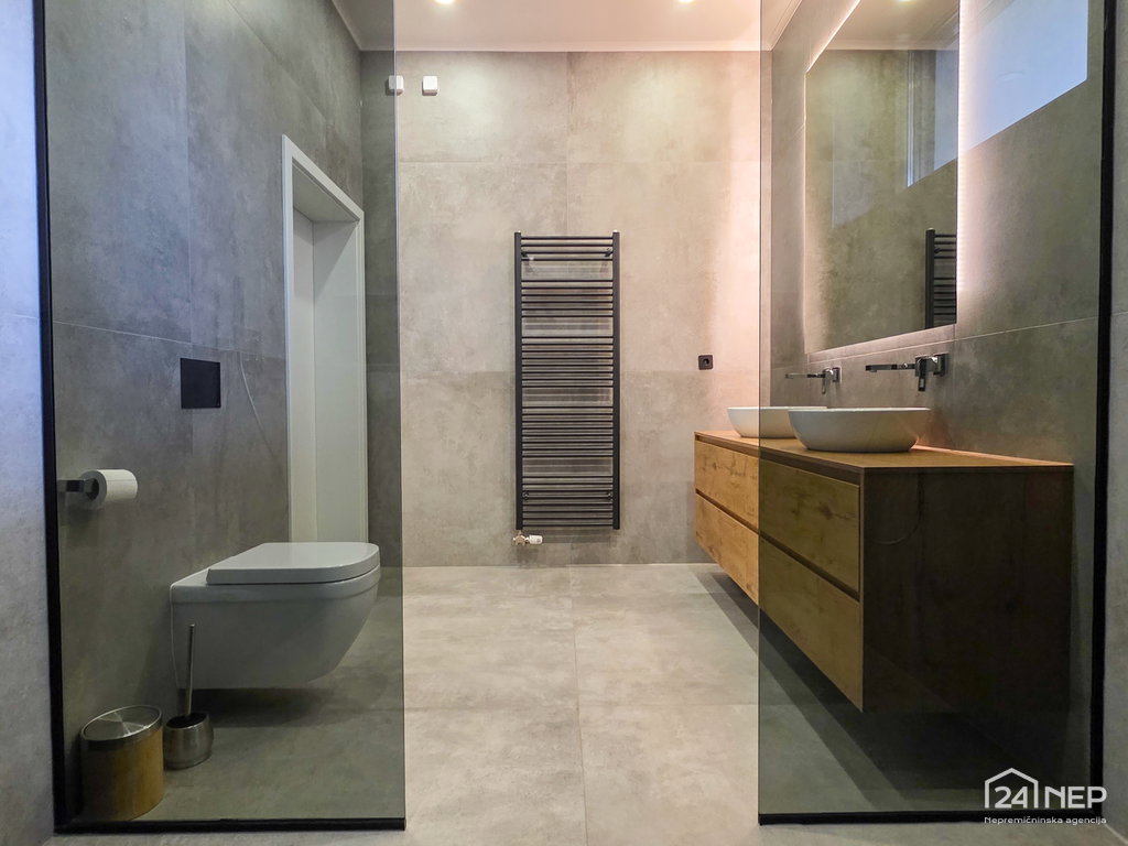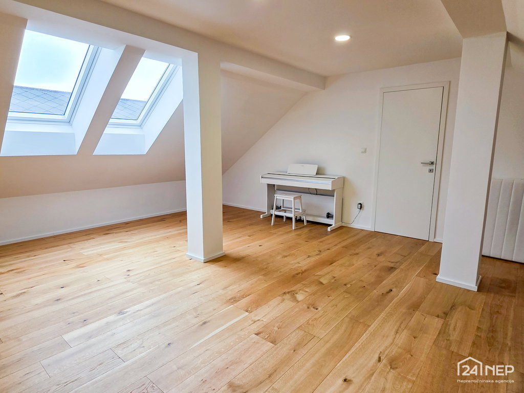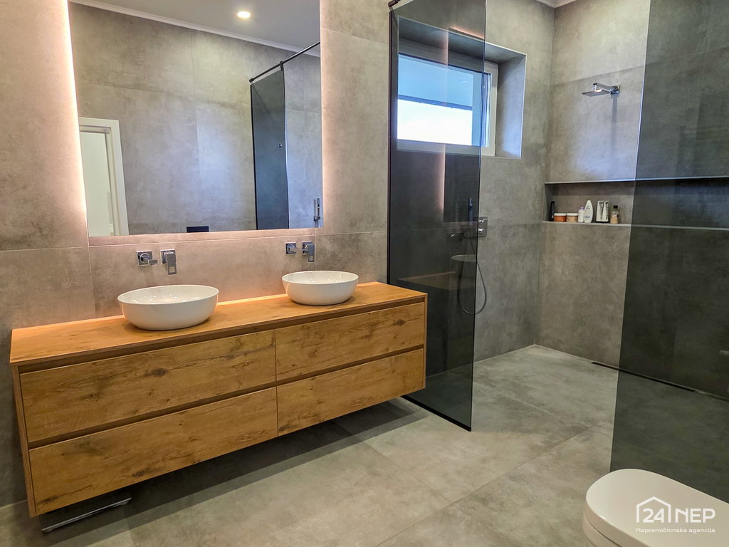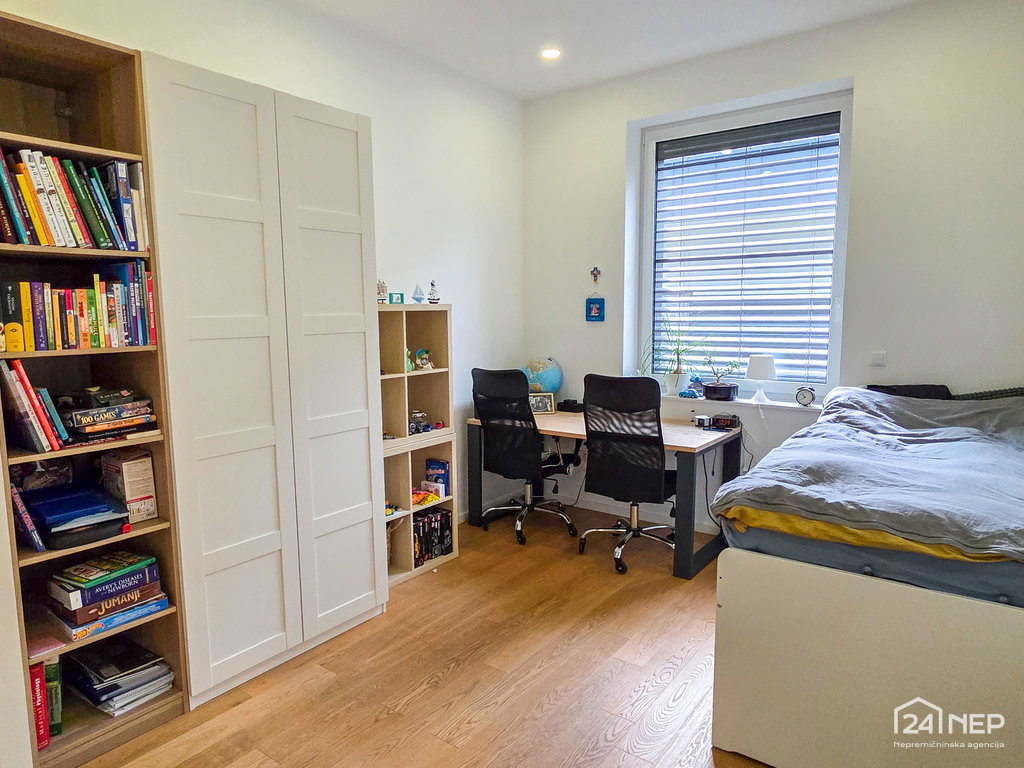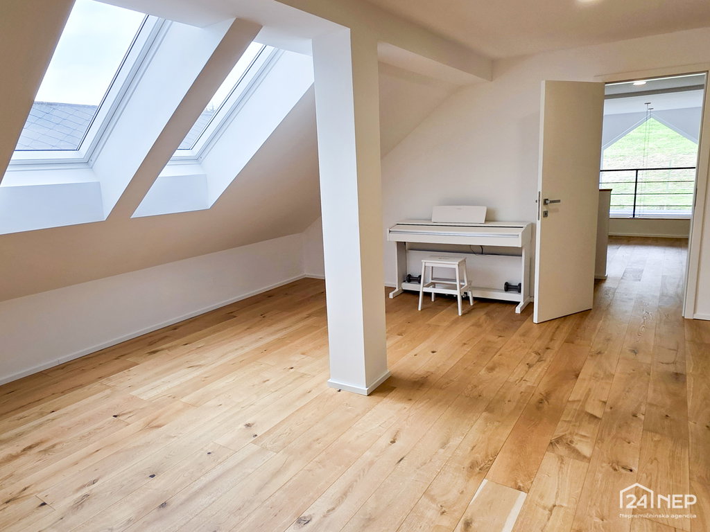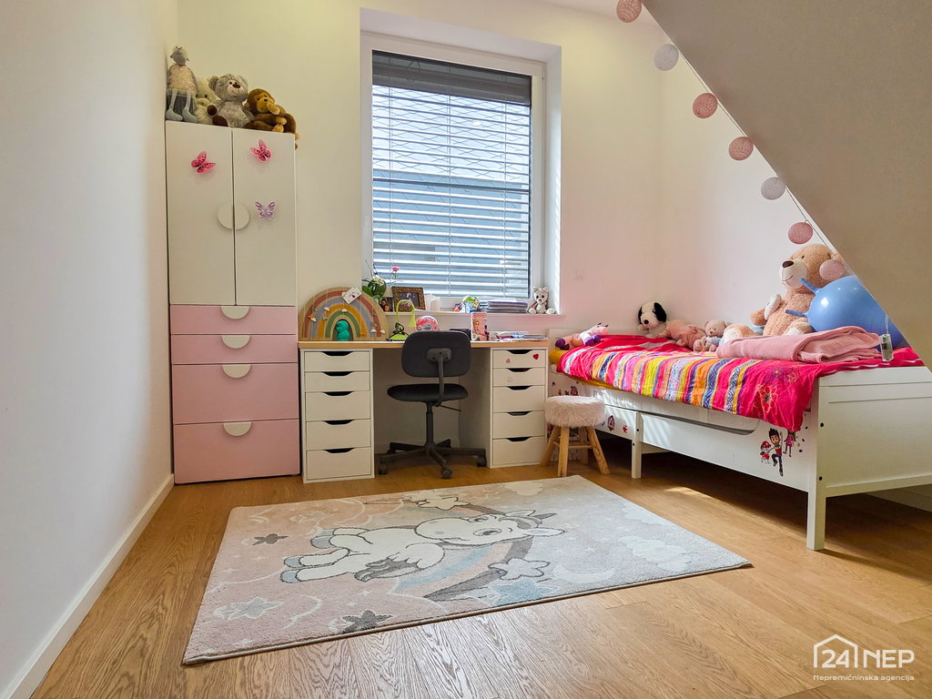 - Razporeditev: predprostor, hodnik, 2x kopalnica, kuhinja, jedilnica, dnevna soba, 2x otroška soba, spalnica z garderobo, utility.