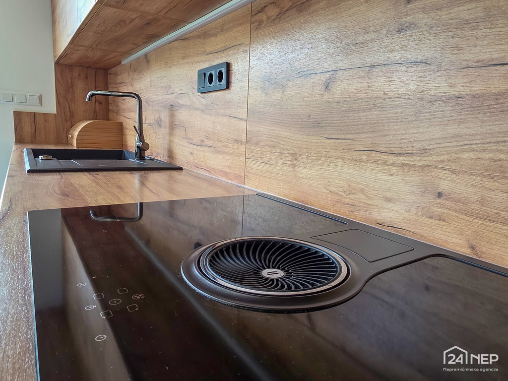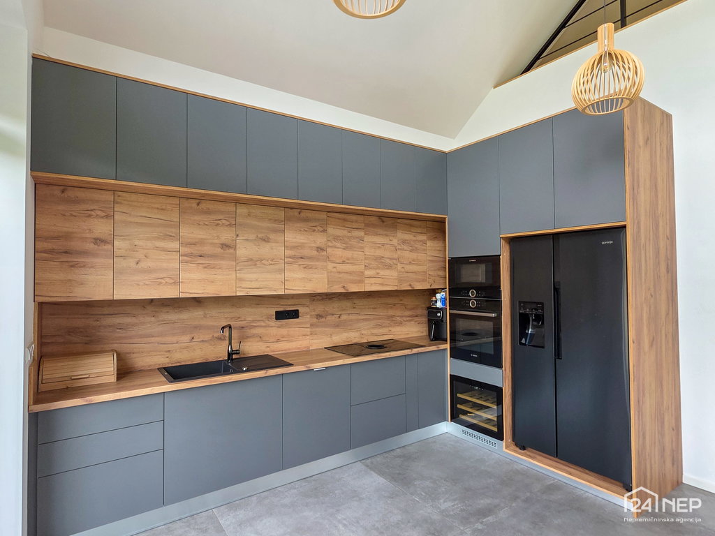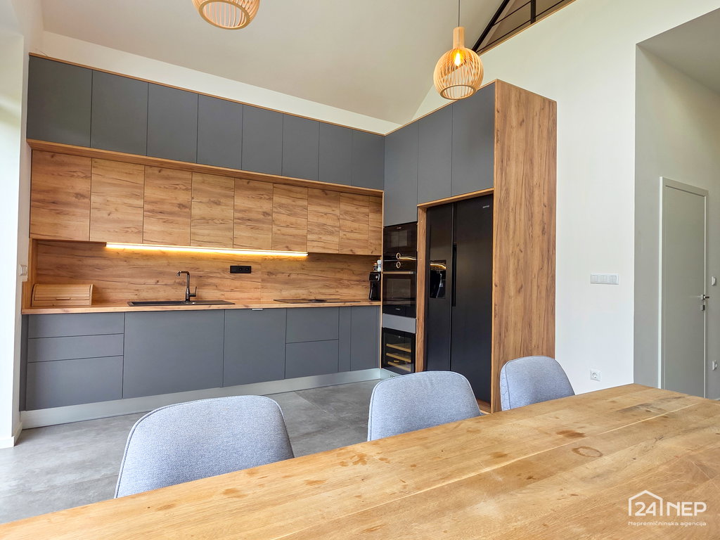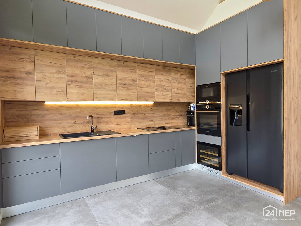 - Kuhinja po meri z aparati BOSCH (vgradna pečica, vgradna mikrovalovna pečica, pomivalni stroj) in Gorenje (ameriški hladilnik), vinska vitrina, indukcijska kuhalna plošča z vgrajeno napo