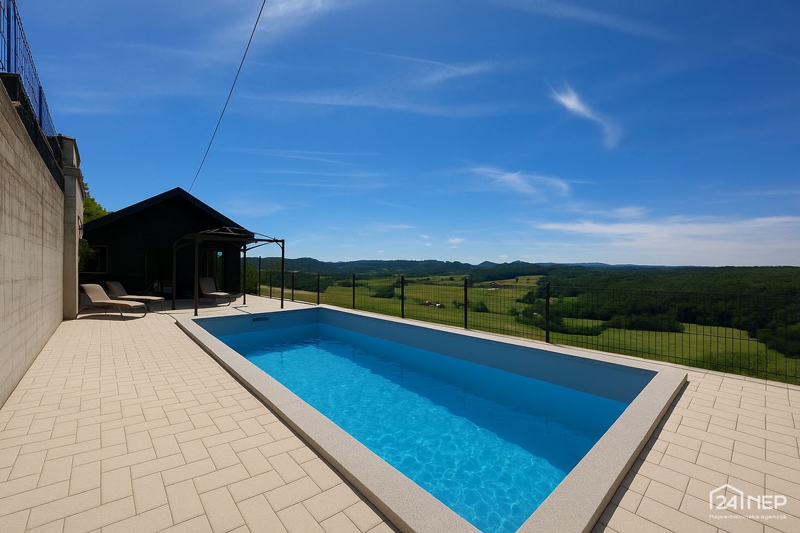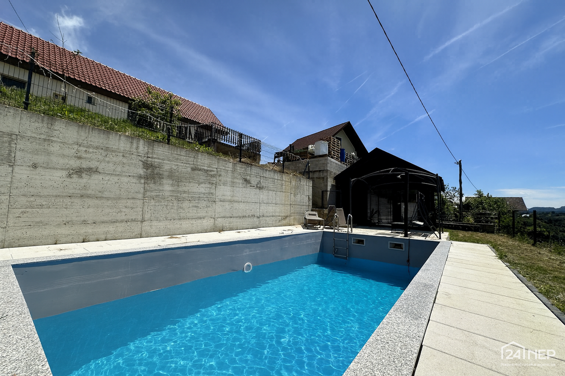 Na prodaj je prijetna samostojna hiša z bazenom in letno hiško, ki ponuja odlično priložnost za udobno bivanje v objemu narave ali za oddajanje v turistične namene.