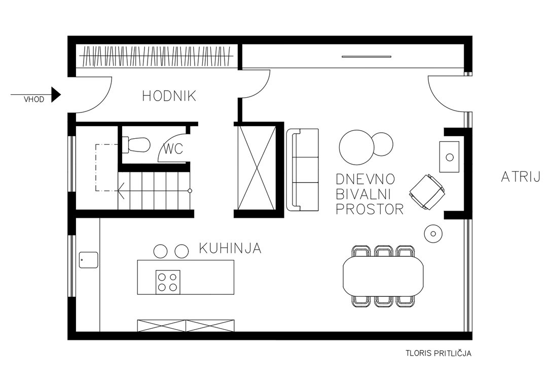 PRITLIČJE: hodnik, velik dnevno bivalni prostor z izhodom na teraso, jedilnica, kuhinja, hodnik, wc