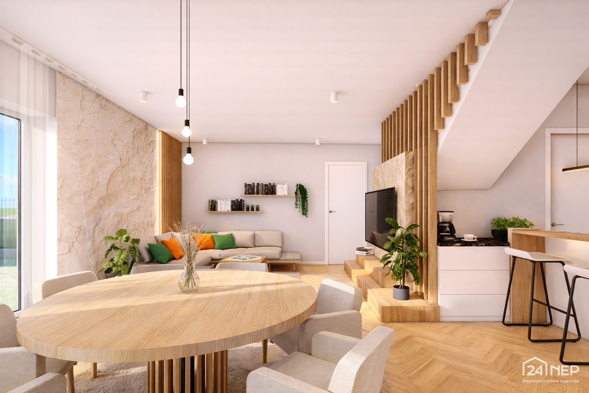 - Prostoren in svetel dnevni prostor s kuhinjo in jedilnico ter izhodom na teraso in zelenico 43,10 m2