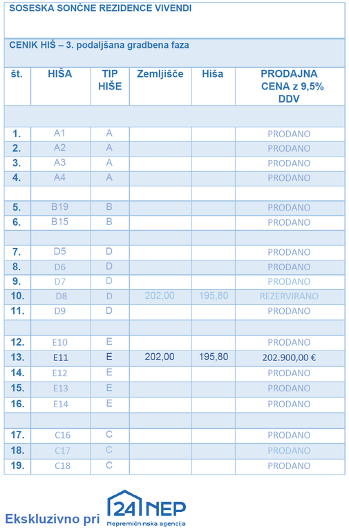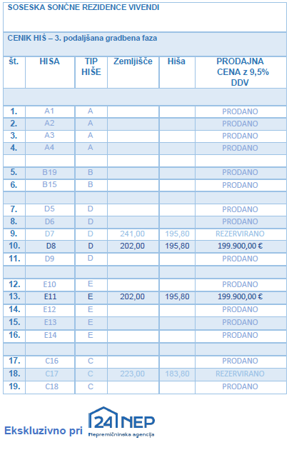 Cena zajema izvedbo do tretje podaljšane gradbene faze (vgrajena oz. zgrajena bodo okna, vhodna vrata, streha, fasada, dovozi ter osnovna ureditev okolice, nadstrešek s kolesarsko lopo).